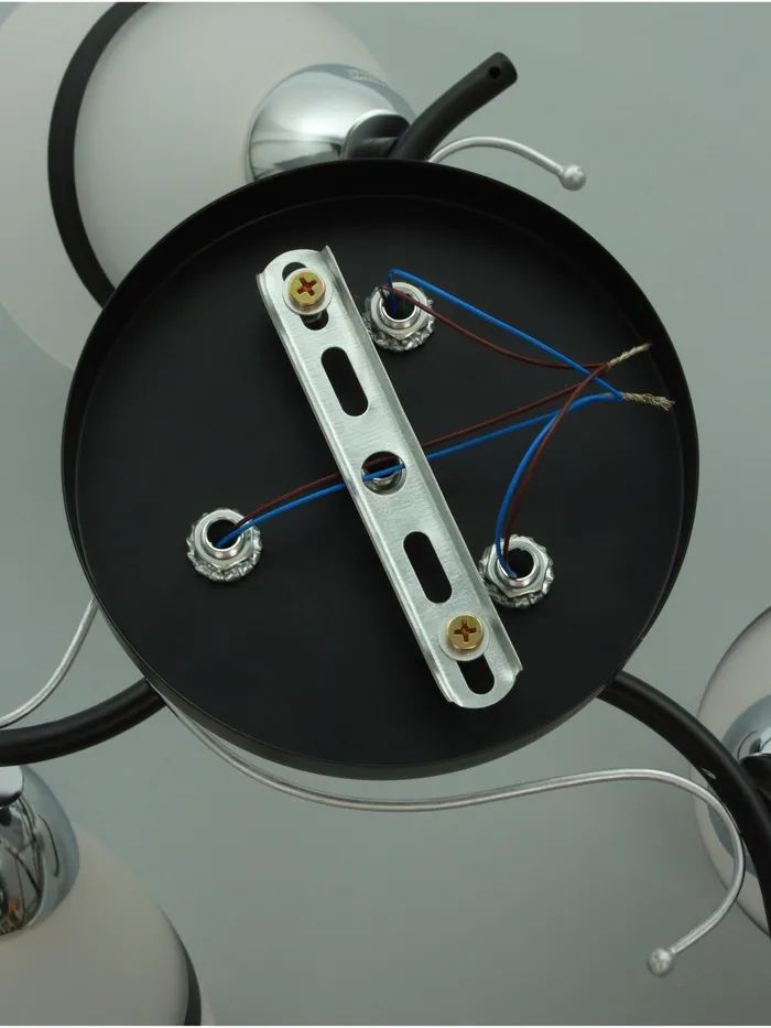 - Чёрное основание с хромированными акцентами: придаёт люстре благородный и современный вид, идеально сочетаясь с интерьерами в стиле хай-тэк.