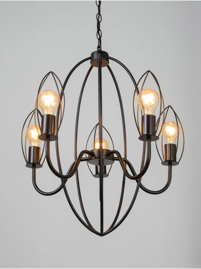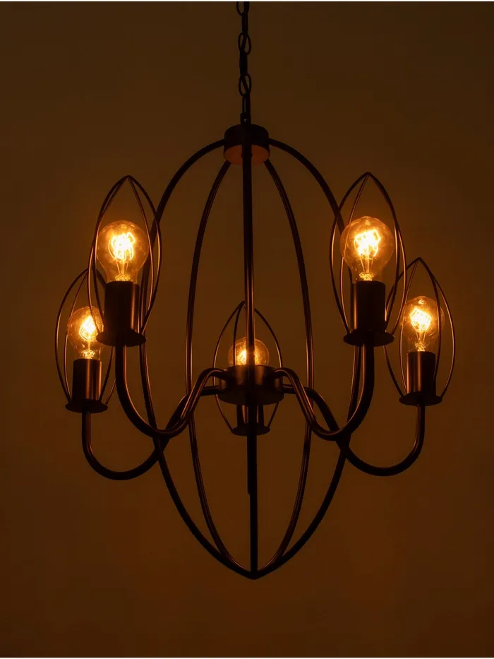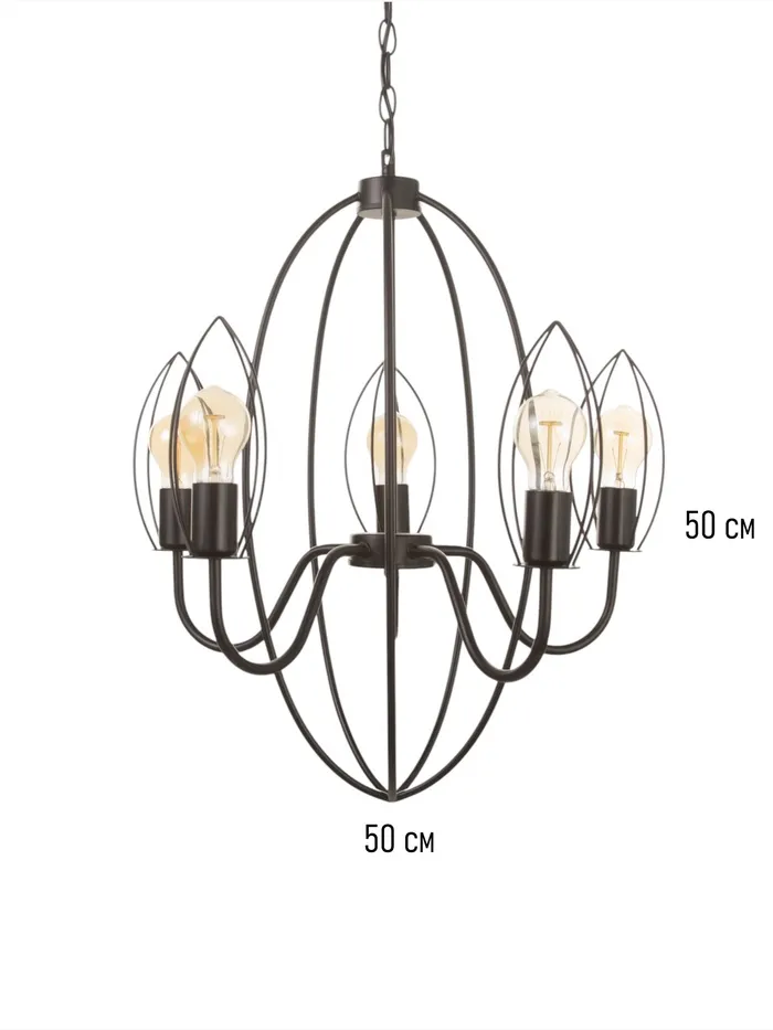 Люстра оснащена пятью лампочками накаливания с цоколем E14, каждая из которых имеет мощность 40 Вт. Обеспечивает яркий и равномерный свет, способный осветить площадь до 10 квадратных метров. Высота светильника составляет 88 см, а максимальная высота от потолка достигает 128 см, что делает его подходящим для помещений с высокими потолками.