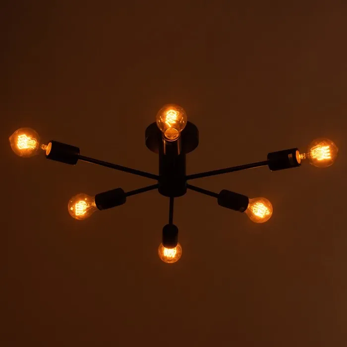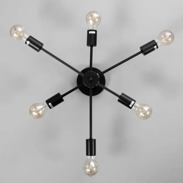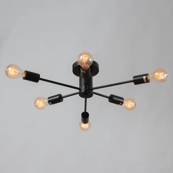 Это решение создано для тех, кто хочет видеть на потолке не просто источник света, а полноценный элемент оформления. Чёрный цвет, 6 ламп, стиль лофт — всё это работает на контраст, тепло и точное попадание в интерьер, где важны детали и мощность светового потока.