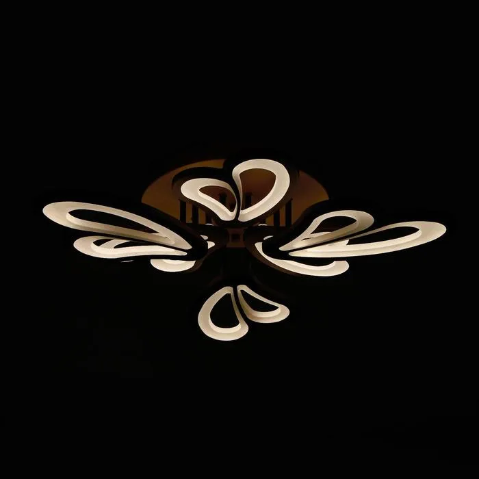 Изделие выполнено из качественного акрила, металла и светодиодов. Срок службы люстры в домашних условиях — 20 000 часов. Подходит для помещений с низкими потолками и для натяжных потолков. Осветит комнату площадью до 28 м².