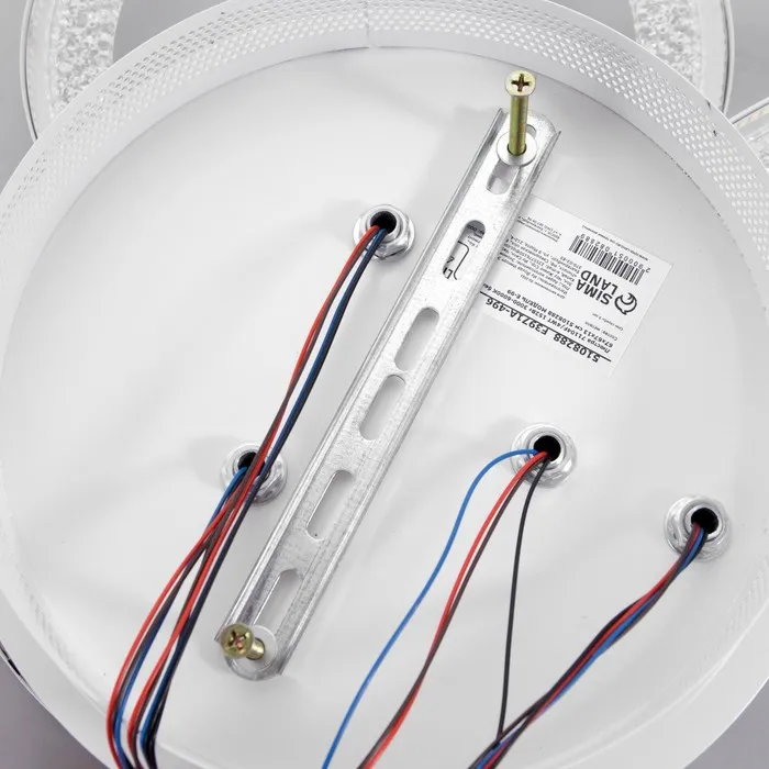 Изделие выполнено из качественного металла, пластика и светодиодов. Срок службы люстры в домашних условиях — 20 000 часов. Подходит для помещений с низкими потолками и для натяжных потолков. Осветит комнату площадью до 16 м².
