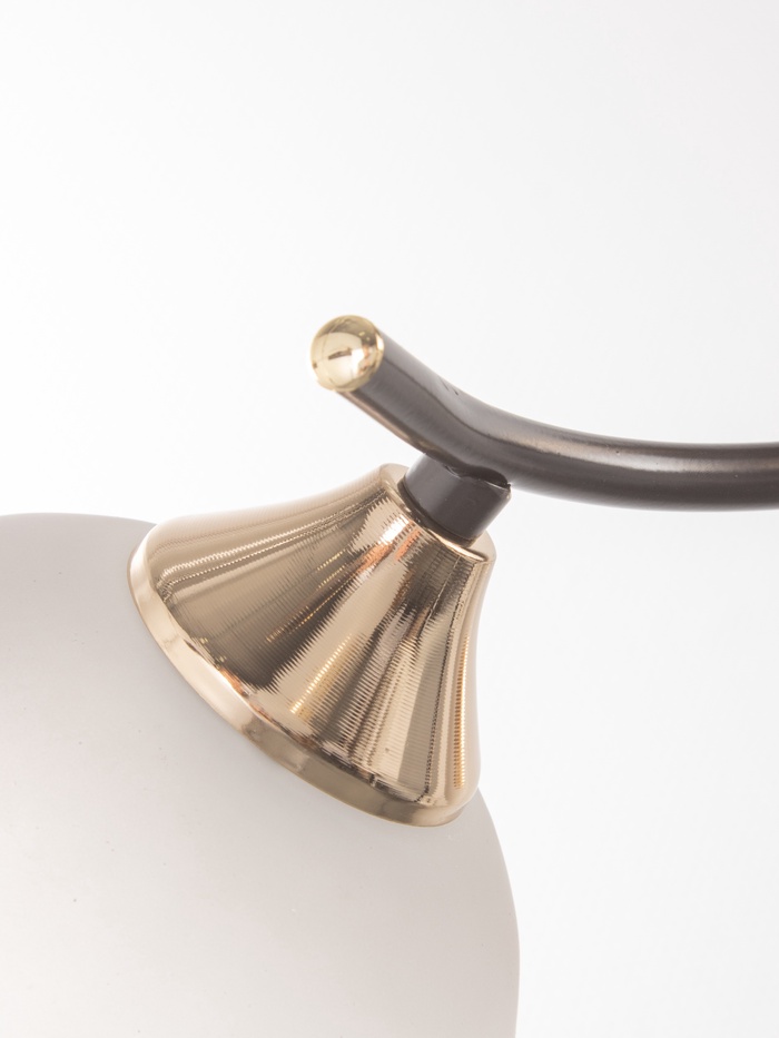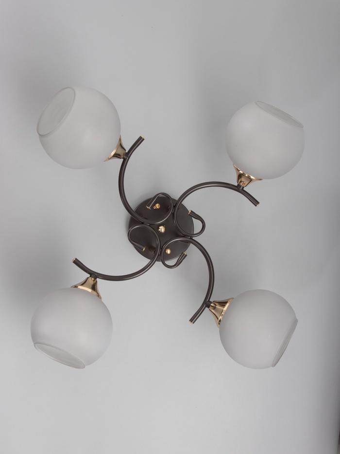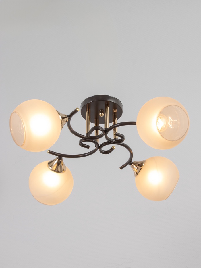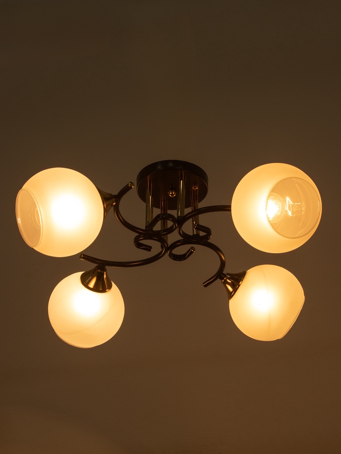 Свет с характером эпохи. Потолочная люстра с четырьмя стеклянными плафонами в стиле арт-деко — выразительное решение для гостиной или спальни до 20 м². Кофейно-золотистое металлическое основание создаёт тёплый контраст с белыми полусферическими стеклянными плафонами, а компактная высота (всего 24 см) при длине 53 см позволяет разместить её даже в помещениях со средней высотой потолков. Лампы не входят в комплект — подойдут любые с цоколем E27 до 60 Вт: накаливания, филаментные или энергосберегающие.