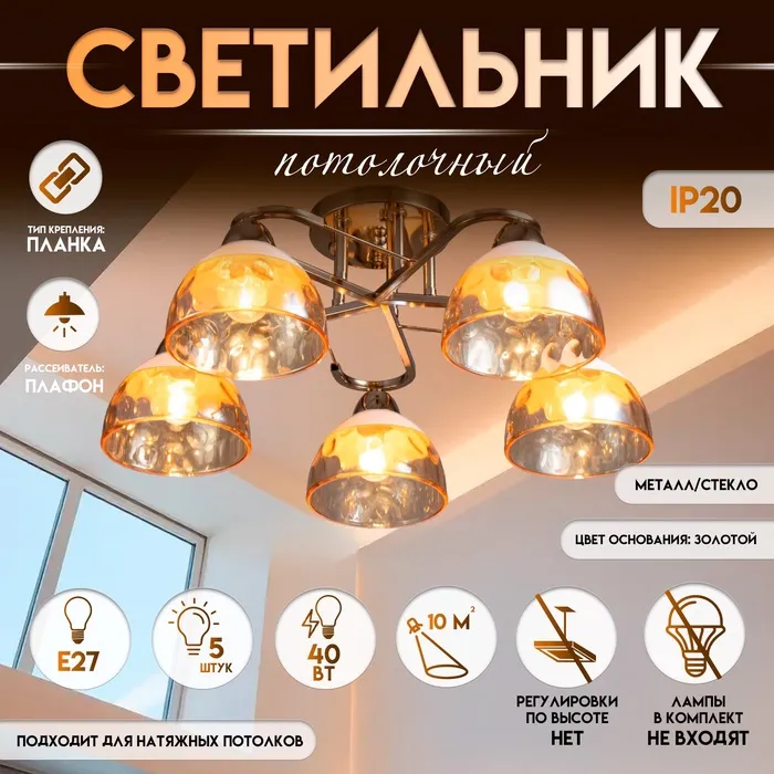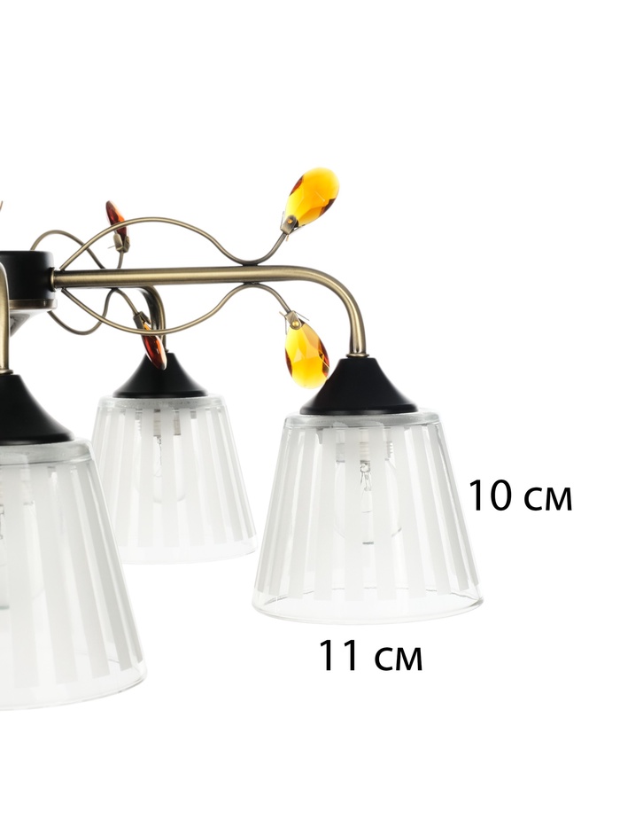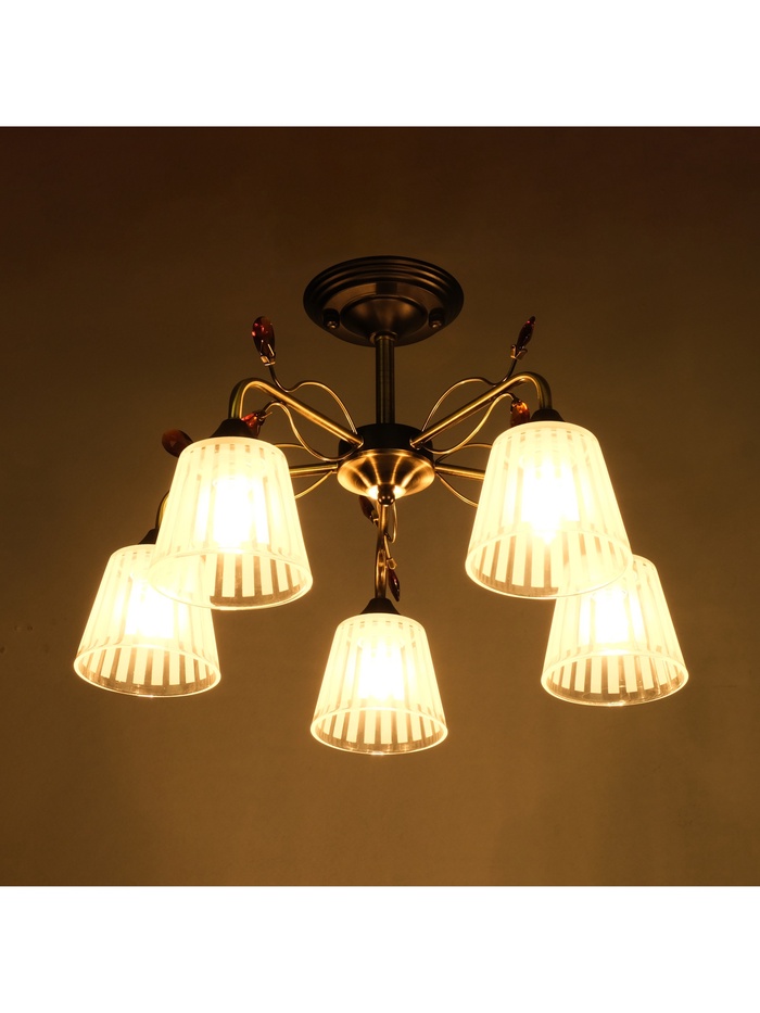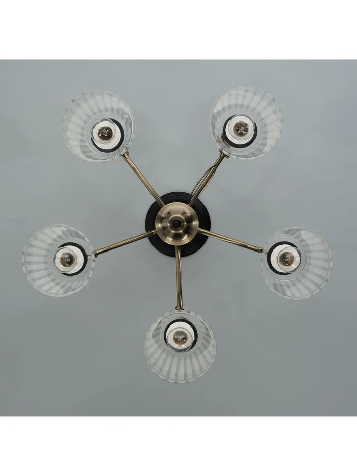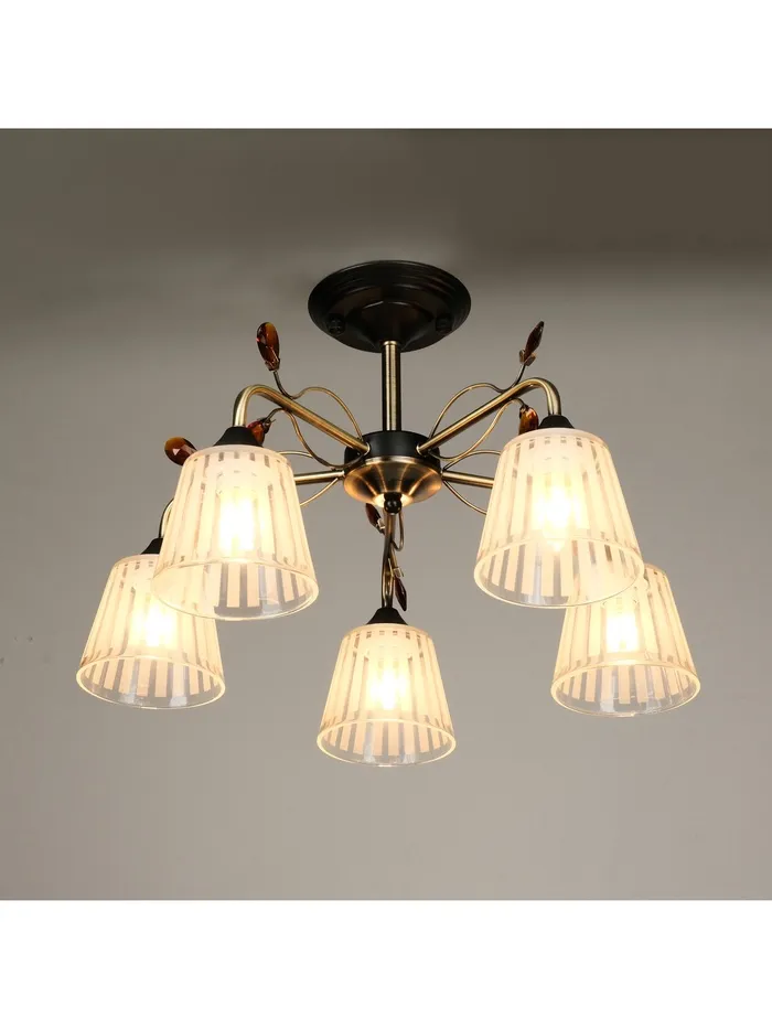 - Насыщенное освещение без лишнего: Пять ламп с цоколем E27 и мощностью до 40 Вт создают плотный световой поток, равномерно распределённый по площади. Прозрачные стеклянные конусные плафоны направляют свет строго вниз — без рассеивания, с чёткими границами освещённой зоны.