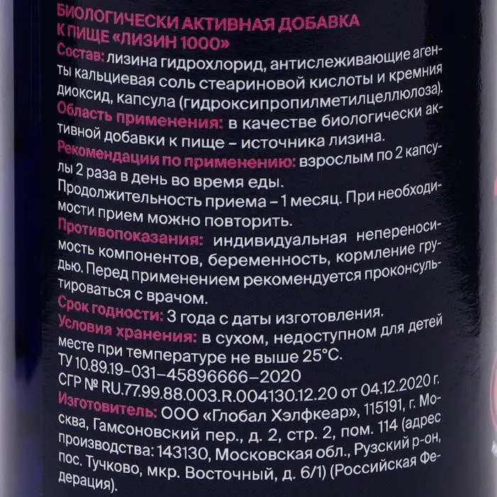 4 вегетарианские капсулы содержат: лизина — 1000 мг.