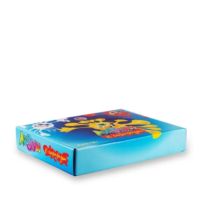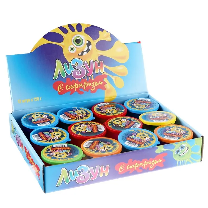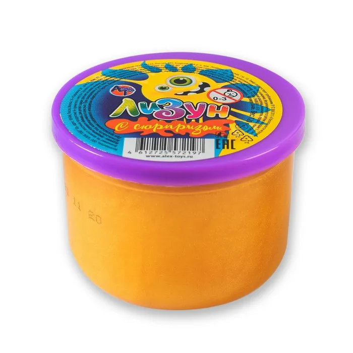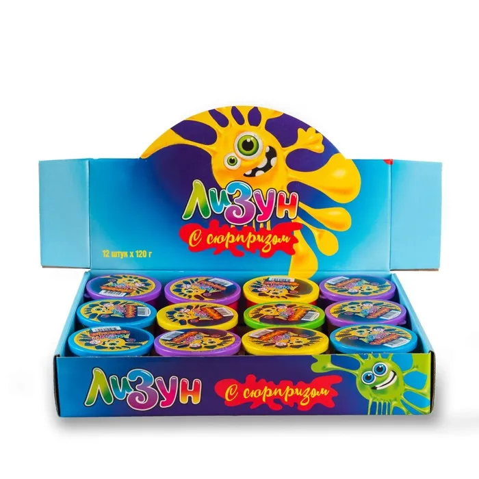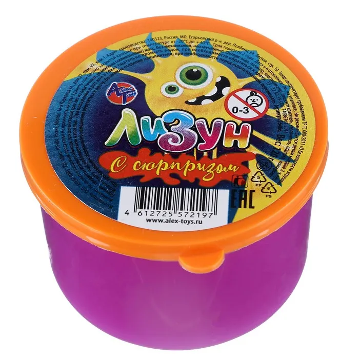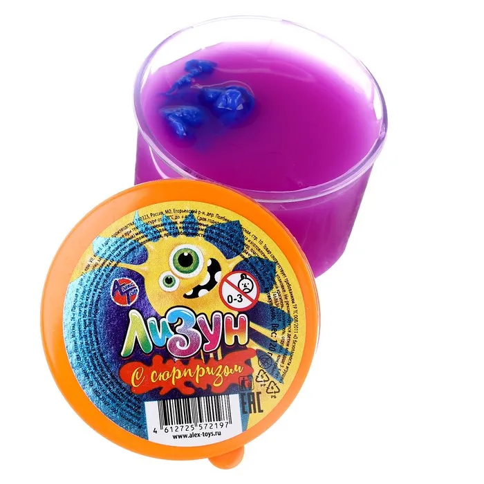 - Лизун не токсичен, не липнет к рукам и одежде, а также в каждой баночке можно найти сюрприз — фигурку с случайным персонажем, которые можно использовать в играх и коллекционировать.