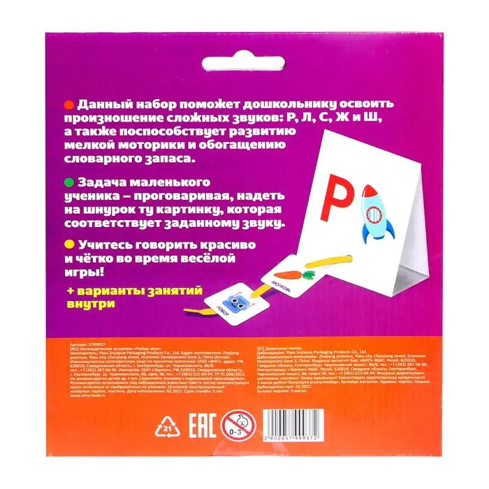 Задача малыша надеть на шнурок ту картинку, которая соответствует заданному звуку. В процессе игры малыш развивает моторику, пополняет свой словарный запас и обучается говорить правильно и красиво.