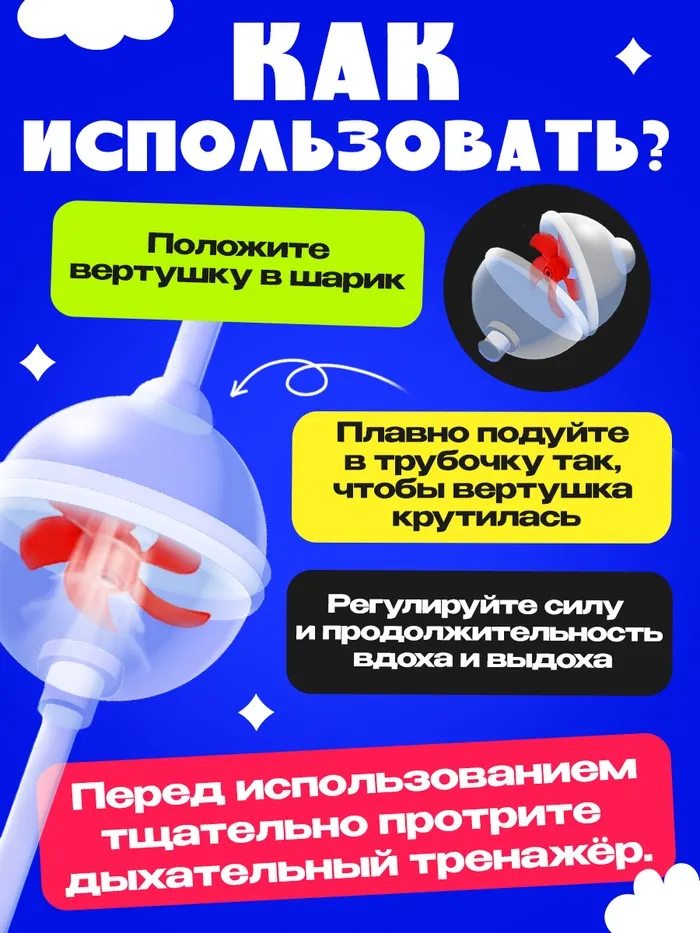 Перед использованием тщательно протрите дыхательный тренажёр. Играть следует под присмотром взрослого человека!