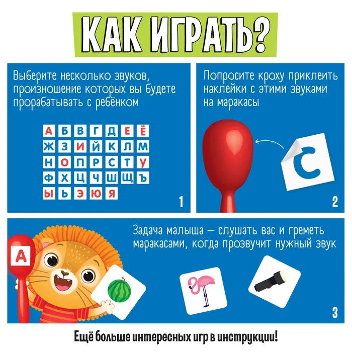 Выберите несколько звуков, произношение которых вы будете прорабатывать с ребёнком. Попросите кроху приклеить их на маракасы. Задача малыша — слушать слова ведущего и греметь маракасами, когда узнал нужный звук.