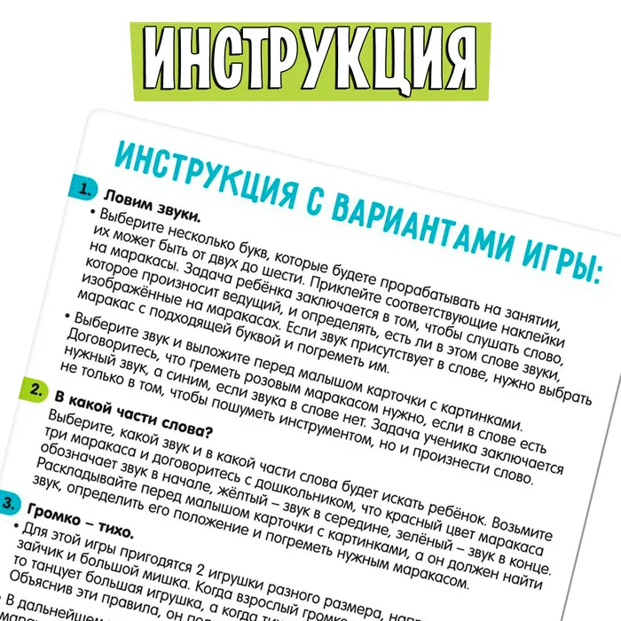 Выберите 2 маракаса и договоритесь с ребёнком, что красный цвет отвечает за звук в начале слова, жёлтый — в середине, зелёный — в конце. Разложите перед малышом карточки с картинками. Попросите его найти звук и прогреметь нужным маракасом.