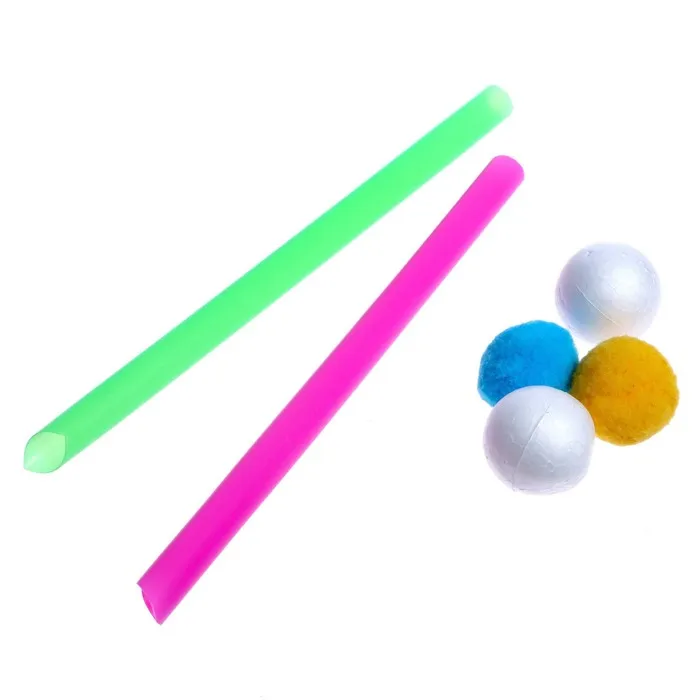 - Предложите ребёнку устроить веселое состязание: кто быстрее сможет довести шарик от начала до конца, дуя на него через трубочку.