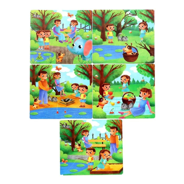 Ребёнка ждут 10 сюжетных картинок и фишки, с помощью которых он должен составить предложения про героев.