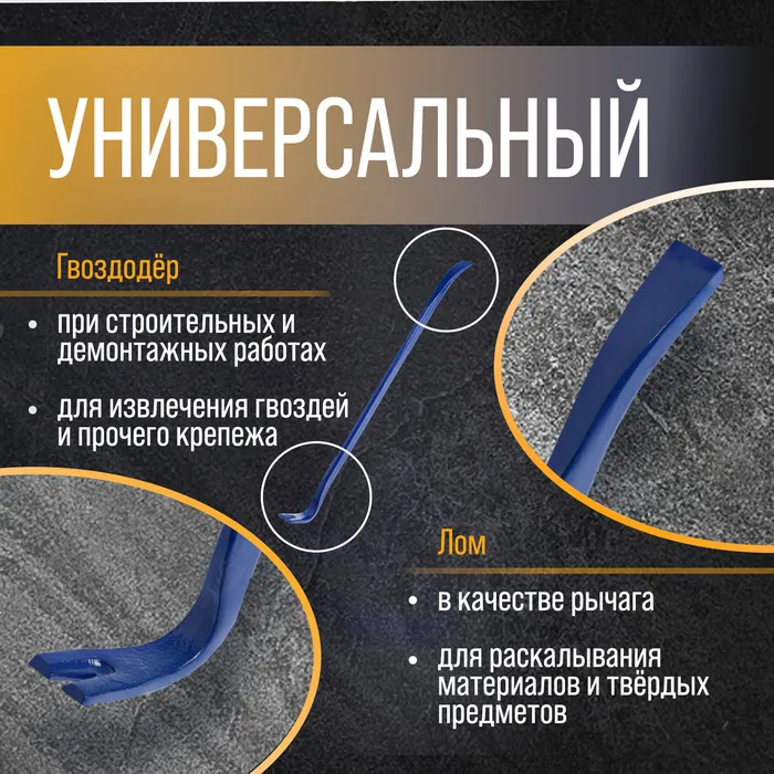 Гвоздодёр-лом ТУНДРА подходит для удаления гвоздей из досок, для демонтажа старых конструкций, и является помощником не только в профессиональных ремонтных работах, но и в быту. Такой инструмент используется для разрушения различных материалов.