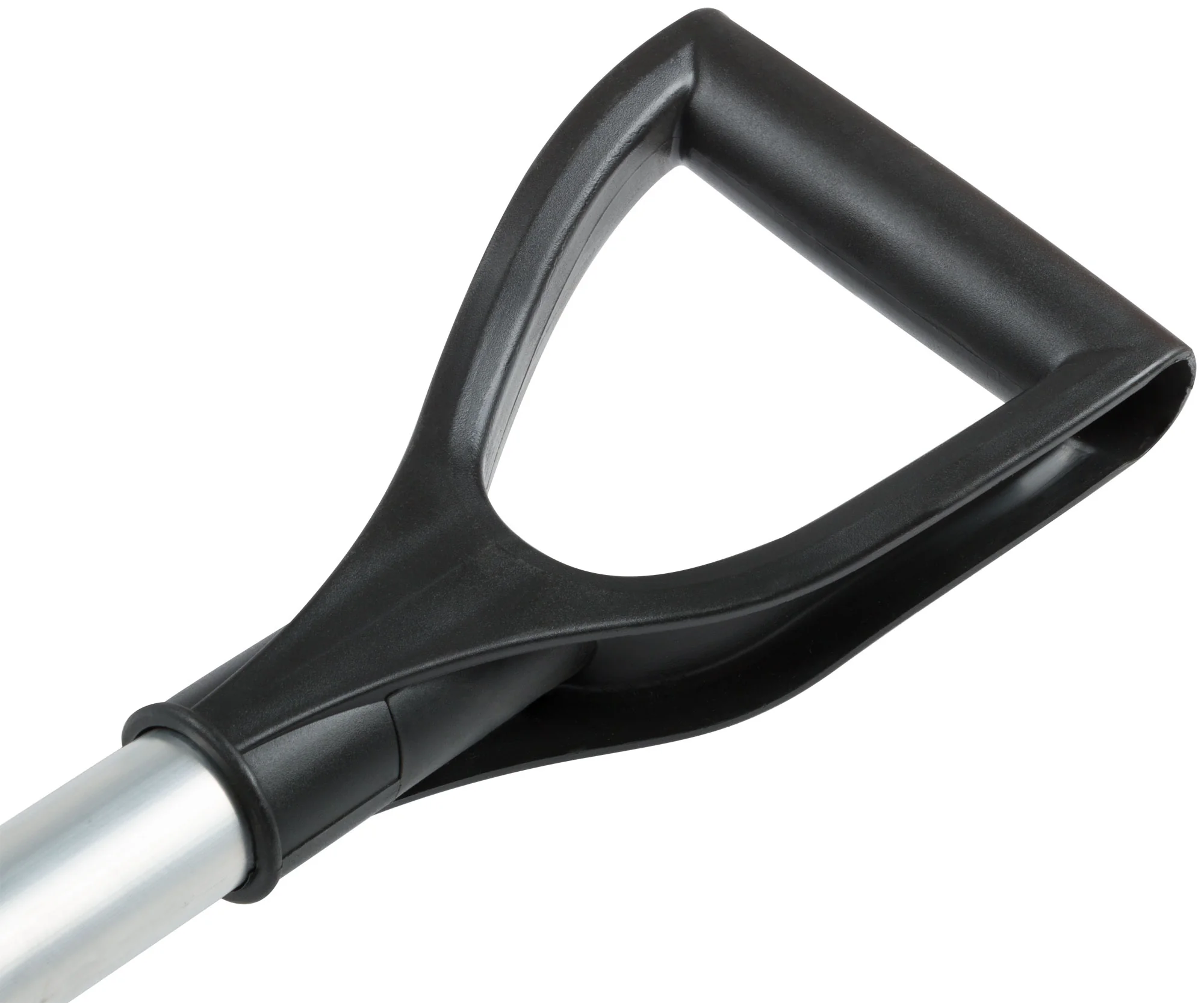 Лопата оснащена укороченным алюминиевым черенком и V-ручкой, что обеспечивает удобный хват и простоту использования. Рабочая часть изготовлена из прочного полипропилена, усиленного алюминиевой планкой для дополнительной надежности.