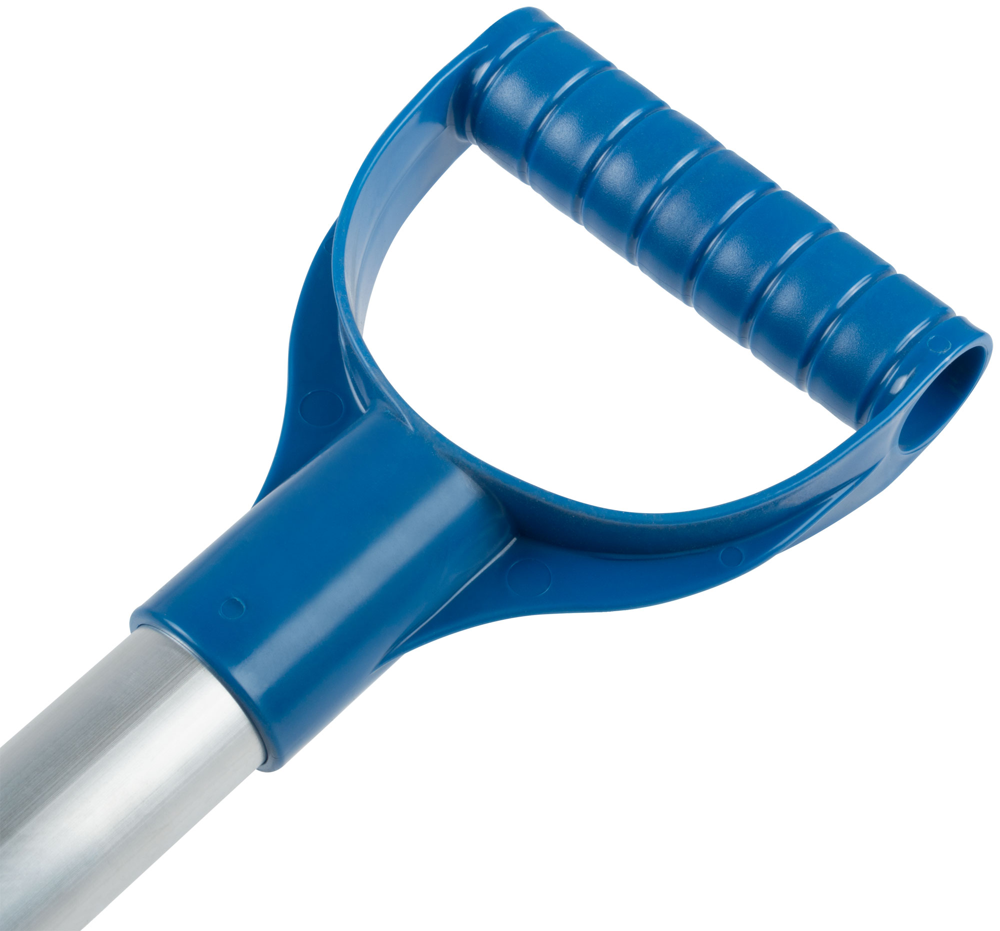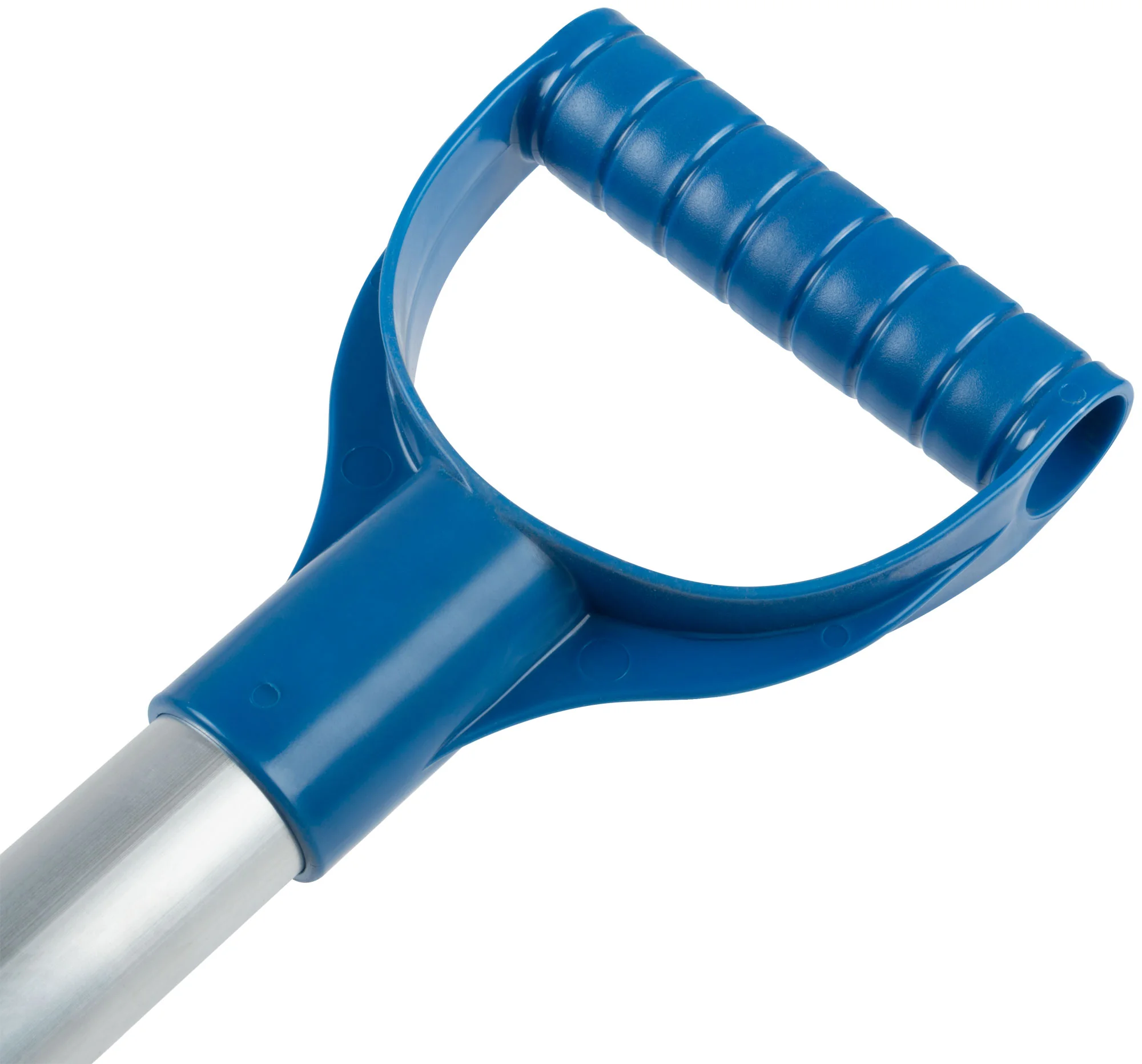 Лопата оснащена особо прочным поликарбонатным ковшом, который выдерживает высокие нагрузки и не подвержен истиранию. Алюминиевый черенок обеспечивает легкость и долговечность инструмента, а пластиковая ручка добавляет удобства в работе.