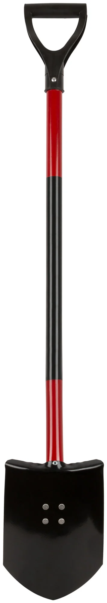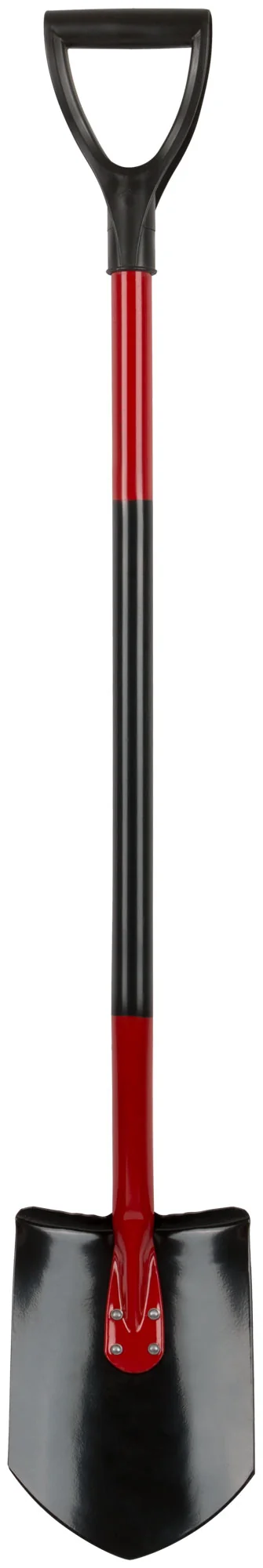 Лопата изготовлена из углеродистой стали, что гарантирует ее долговечность и надежность. Металлический черенок обеспечивает дополнительную прочность, а V-ручка позволяет комфортно удерживать инструмент при работе.