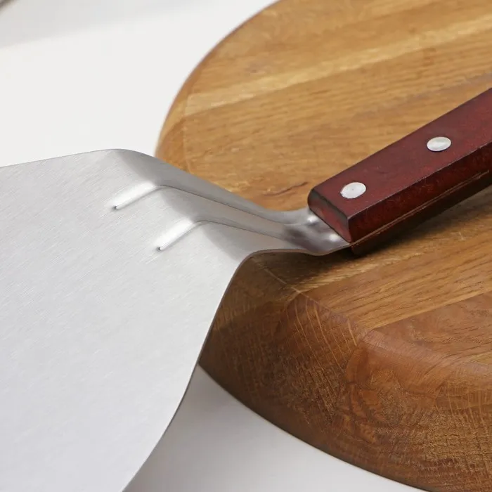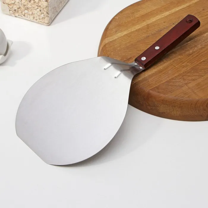 Изготовленная из прочной нержавеющей стали и дерева, лопатка отличается высокой надежностью и долговечностью. Легкий вес и эргономичная форма делают её использование комфортным, позволяя аккуратно переносить пиццу или коржи, не повредив их поверхность.