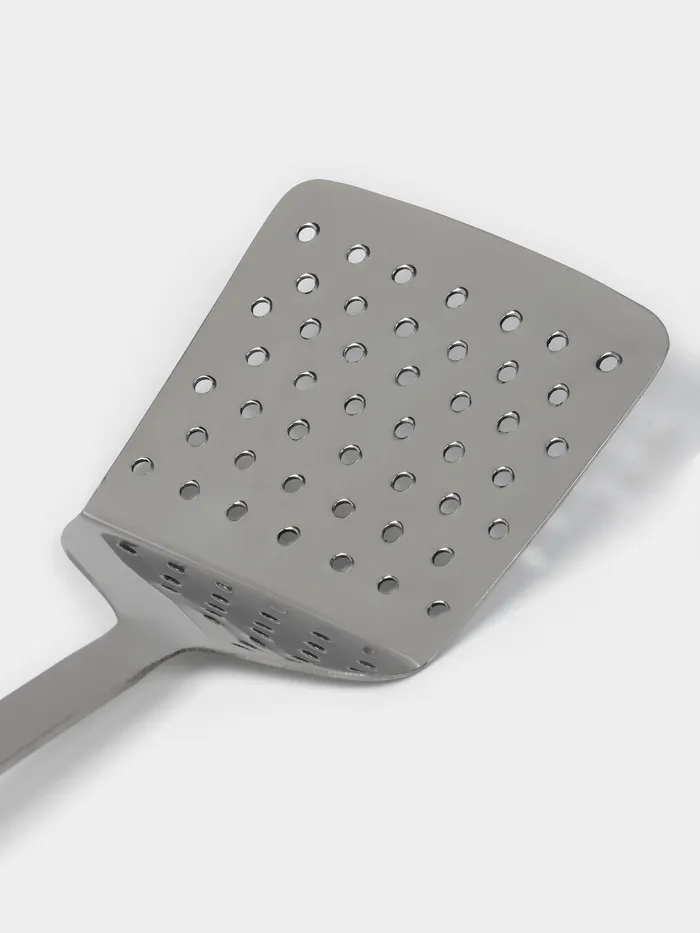 Изготовленная из нержавеющей стали, лопатка отличается прочностью и долговечностью. Серебристый цвет и отсутствие рисунка делают её универсальным аксессуаром, который прекрасно впишется в любой кухонный интерьер.