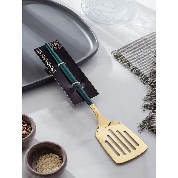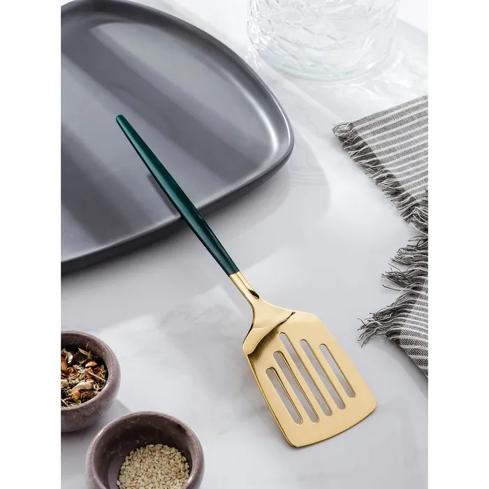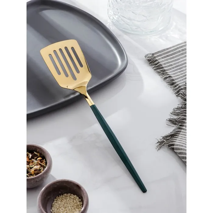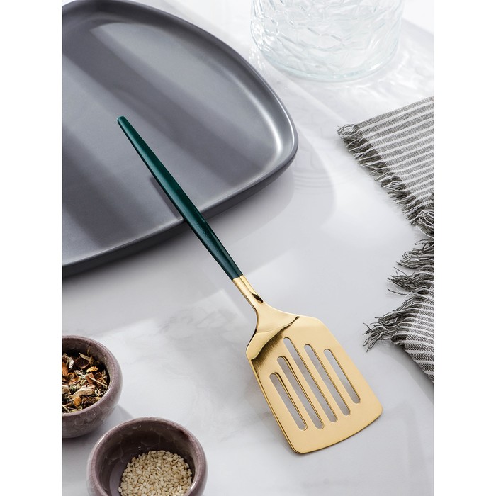 Лопатка перфорированная из нержавеющей стали Magistro «Грэйс», длина 26 см, цвет ручки зелёный, цвет головы золотой — Характеристики