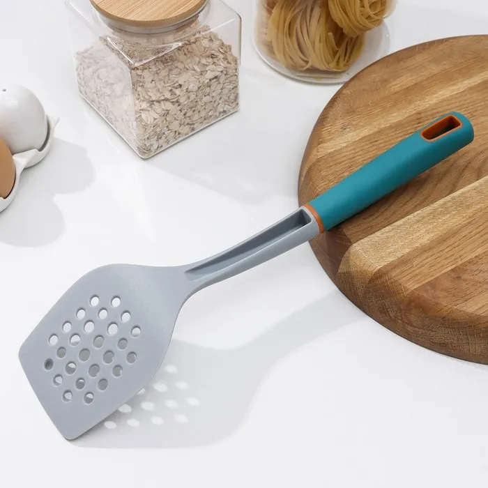 Лопатка с прорезями — практичный кухонный инструмент для аккуратного переворачивания и подачи блюд. Длина 33,7 см обеспечивает удобство использования на сковороде и в духовой печи. Изготовлена из прочного пластика, устойчивого к высоким температурам. Серый цвет делает её универсальной в оформлении кухни, а перфорированная рабочая часть снижает вес и улучшает контроль при работе с жидкими и жирными продуктами.