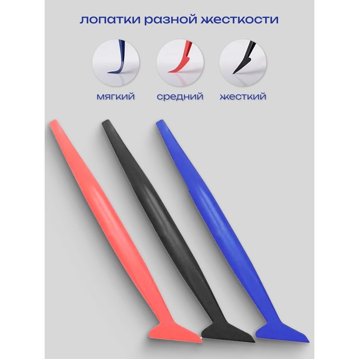 Набор ракелей-лопаток для работы в сложных местах создан для работы с виниловыми пленками на труднодоступных участках, где стандартный ракель бессилен. С помощью набора мини-ракелей вы сможете без проблем заправить пленку при оклейке мест вокруг логотипов и эмблем, на различных углах деталей, а также при оклейке вогнутых частей: мест вокруг фар и уплотнителей по контуру дверей и окон, в углублениях под ручками и т.д.