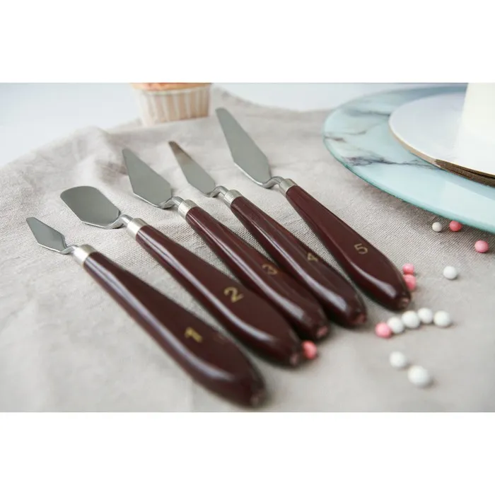 Изготовленные из высококачественной нержавеющей стали, мастихины гарантируют долговечность и стойкость к коррозии. Удобные пластиковые ручки коричневого цвета не только добавляют элегантности, но и обеспечивают надежный захват во время работы, что делает процесс готовки максимально комфортным.