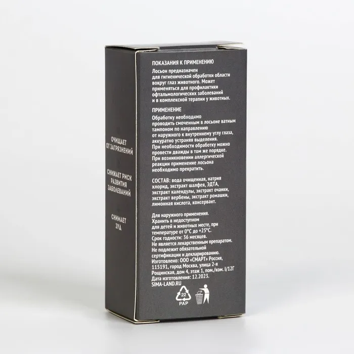 Лосьон предназначен для гигиенической обработки области вокруг глаз животного. Может применяться для профилактики офтальмологических заболеваний и в комплексной терапии у животных.