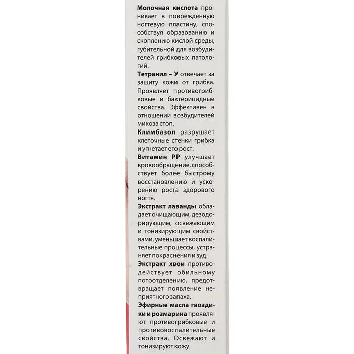 Молочная кислота проникает в поврежденную ногтевую пластину, способствуя образованию и скоплению кислой среды, губительной для возбудителей грибковых патологий. Тетранил – У отвечает за защиту кожи от грибка. Проявляет фунгицидные (противогрибковые) и бактерицидные свойства. Эффективен в отношении возбудителей микоза стоп. Климбазол разрушает клеточные стенки грибка и угнетает его рост. Витамин РР используется с целью улучшения кровообращения, что способствует более быстрому восстановлению и ускорению роста здорового ногтя. Экстракт лаванды обладает совокупностью очищающих, дезодорирующих, освежающих и тонизирующих свойств, уменьшает воспалительные процессы, устраняет покраснения и зуд. Способствует улучшению общего состояния кожи. Экстракт хвои противодействует обильному потоотделению, предотвращает появление неприятного запаха. Эфирное масло гвоздики проявляет противогрибковые и антивоспалительные свойства.