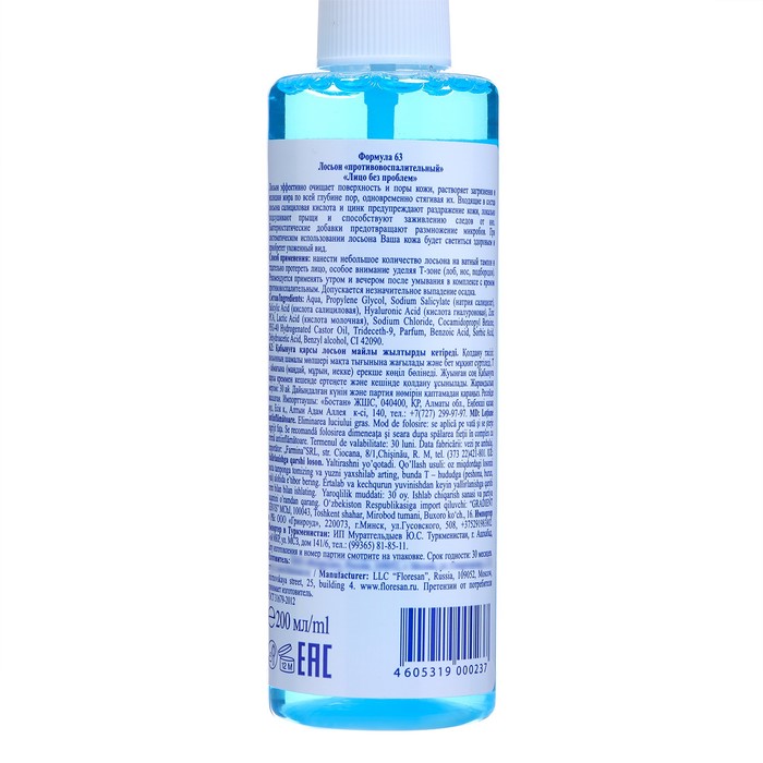 Способ применения: нанести небольшое количество лосьона на ватный тампон и тщательно протереть лицо, особое внимания уделяя Т – зоне (лоб, нос, подбородок). Рекомендуется применять утром и вечером после умывания в комплексе с кремом противовоспалительным.