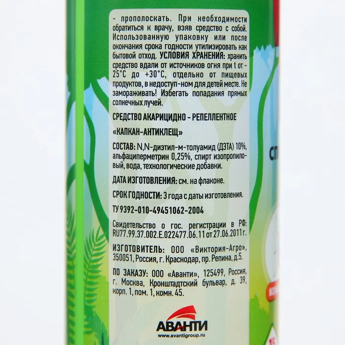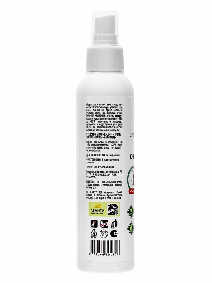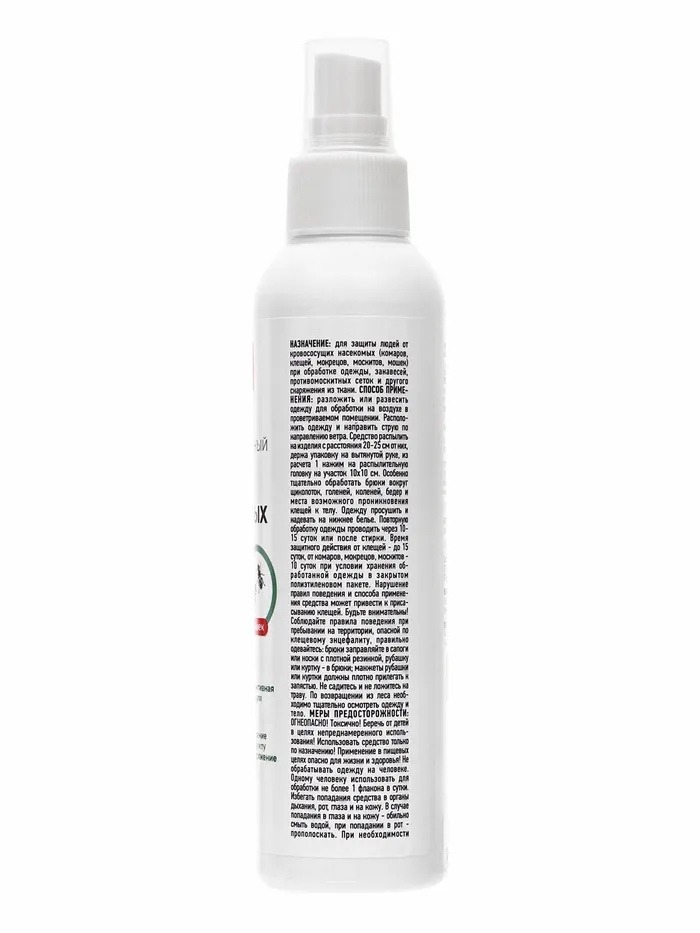 Описание:Спрей универсальный ARGUS предназанчен для защиты людей от кровососущих насекомых - комаров, клещей, мокрецов, москитов, мошек - при обработке одежды, занавесей, пртивомоскитных сеток и другого снаряжения из ткани.Применение:Разложить или развесить одежду для обработки на воздухе или в проветриваемом помещении. Расположить одежду и направить струю по направлению ветра. Средство распылять на изделие с расстояния 20 - 25 см от них, держа упаковку на вытянутой руке, из расчета 1 нажим на распылительную головку на участок 10 х 10 см. Особенно тщательно обработать брюки вокруг щиколоток, голеней, коленей, бедер и места возможного проникновения клещей к телу. Одежду просушить (не менее 2 часов) и надевать на нижнее белье. Повторную обработку одежды проводить через 10 - 15 суток или после стирки. Не обрабатывать одежду на человеке и не надевать ее до полного высыхания. Не обрабатывать кожу.Время защитного действия от клещей - до 15 суток, при условии хранения обработанной одежды в закрытом полиэтиленовом пакете.Действующее вещество: диэтилтоуламид 10 %,альфациперметрин 0,25%.