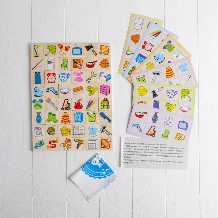 Лото "Предметы" - это увлекательная игра, которая поможет развить творческое воображение, логическое мышление, познакомит ребенка с такими понятиями как: "цвет", "форма", "величина". В каждый набор лото входит 6 карточек и 48 фишек, а в игре могут участвовать от 2 до 6 человек. Правила игры просты: карточки распределяются между игроками, а фишки по одной достаются ведущим из мешочка и игрок, у которого на карточке есть такая же картинка, как на фишке, забирает фишку себе и закрывает ей соответствующую картинку на карточке. Тот, кто первым закрыл на своих карточках все картинки, становится победителем.