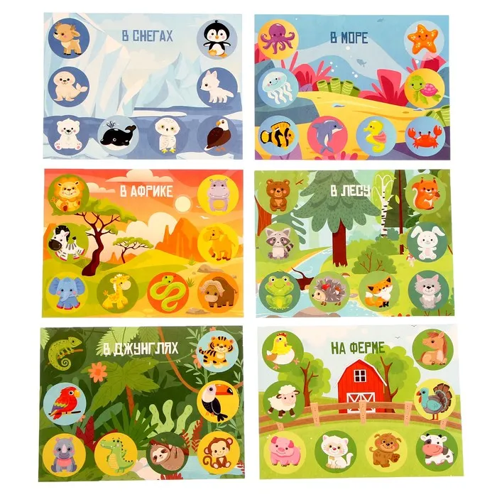 Лото с деревянными фишками «Кто где живёт?» — развивающая, захватывающая и яркая игра на внимание для самых маленьких, с помощью которой малыш узнает много нового: какие животные живут в Африке, в джунглях, в снегах, в лесу, в море, на ферме.