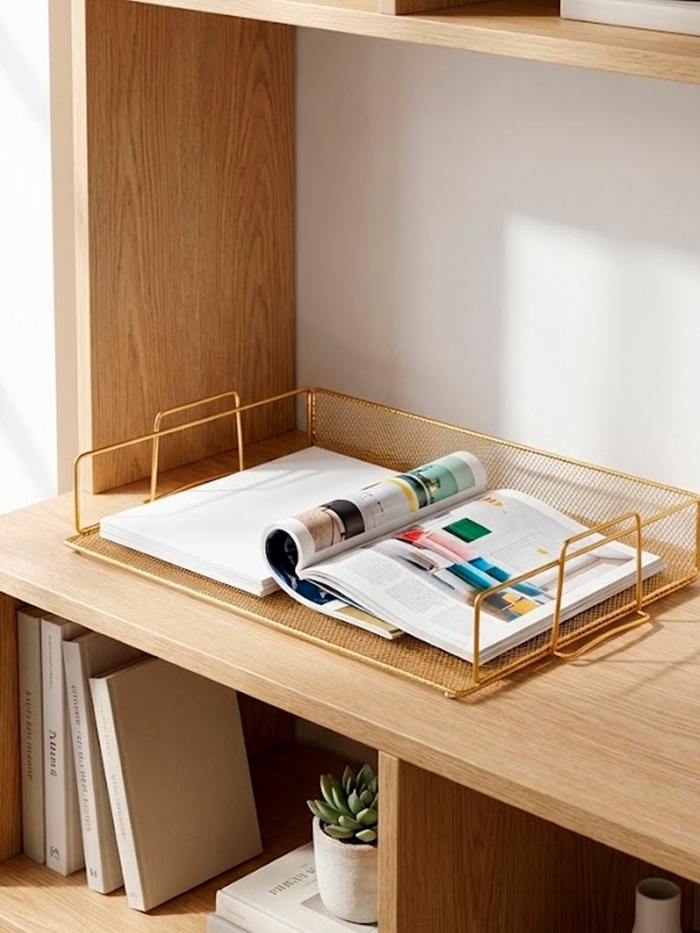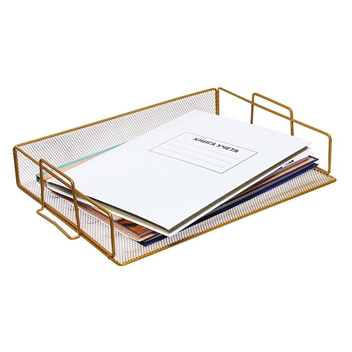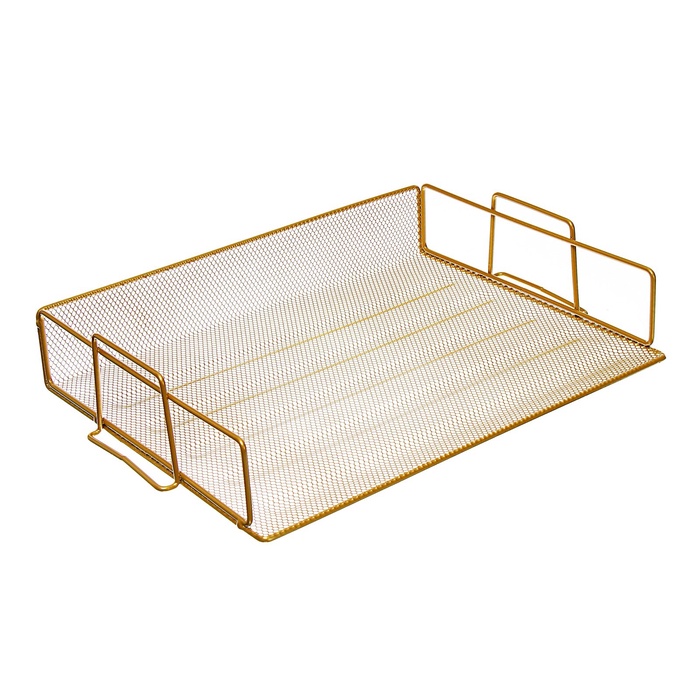 Золотистая горизонтальная лоток-сетка станет стильным акцентом в вашем рабочем пространстве. Этот металлический помощник сохраняет порядок на столе, позволяя вам сосредоточиться на важных задачах. Простой, но элегантный дизайн подходит для любого интерьера и придаёт вашему офису утончённый вид.