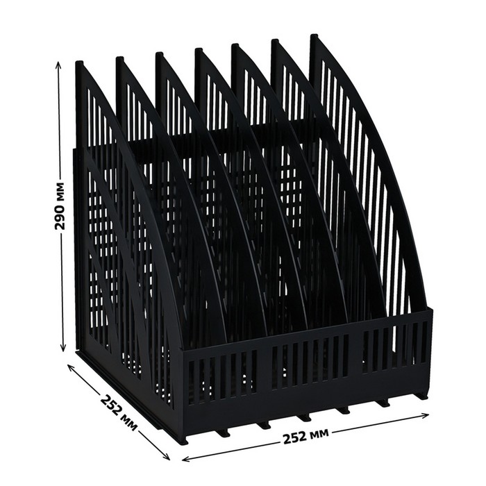 Цвет лотка - черный.Вид товара: лоток для бумагТип: вертикальныйВысота: 290 ммГлубина: 252 ммШирина: 252 ммКоличество секций: 6Материал корпуса: пластикЦвет: черныйСборный: даВместимость, в листах: 1800Упаковка ед. товара: термоусадочная пленкаВес: 690 ГПоставляется в разобранном виде: даОкно для маркировки: нет
