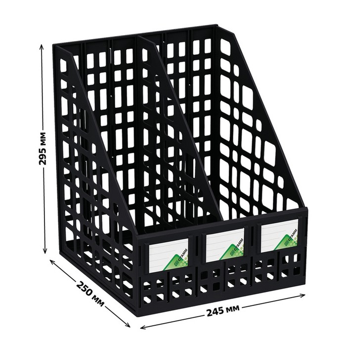 Вид товара: лоток для бумагТип: вертикальныйВысота: 295 ммГлубина: 250 ммШирина: 245 ммКоличество секций: 2Материал корпуса: пластикЦвет: черныйСборный: даВместимость, в листах: 1800Упаковка ед. товара: термоусадочная пленкаВес: 400 ГПоставляется в разобранном виде: даОкно для маркировки: есть