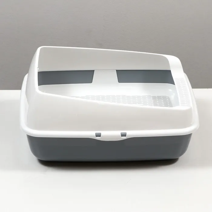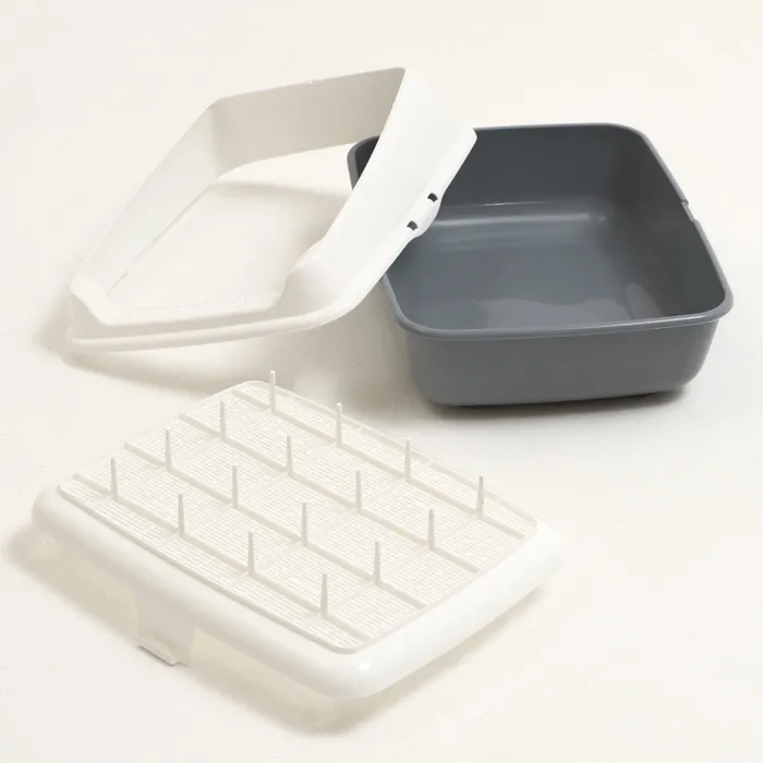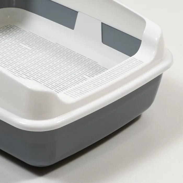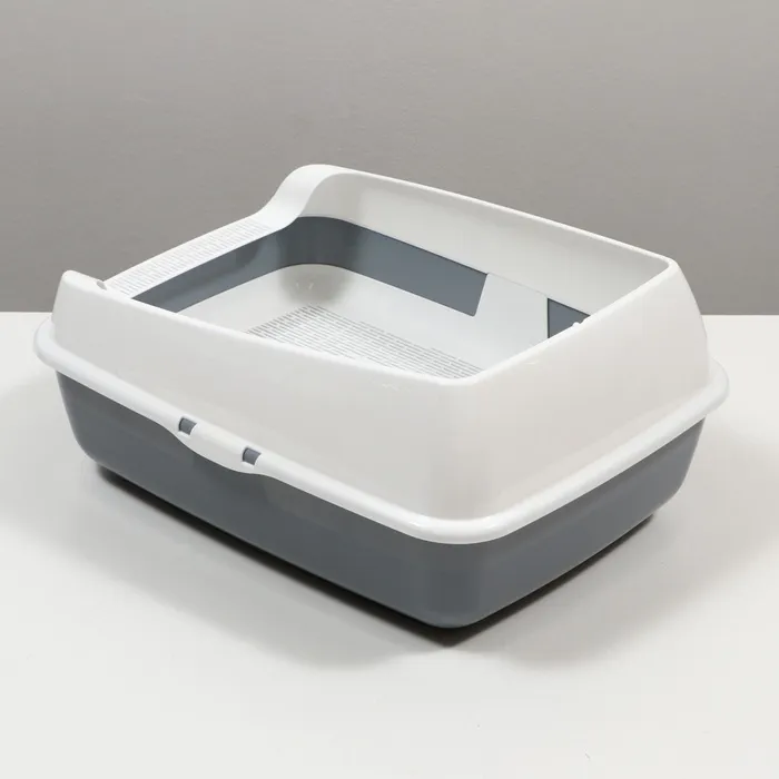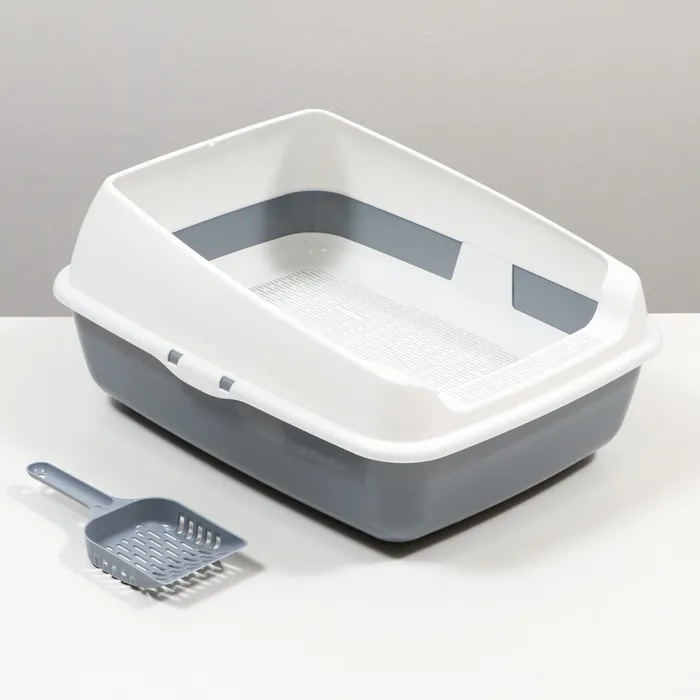 Лоток для кошек с совком, сеткой и бортиком изготовлен из высококачественного пластика, безопасного для животных.