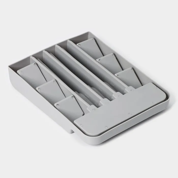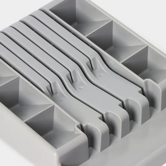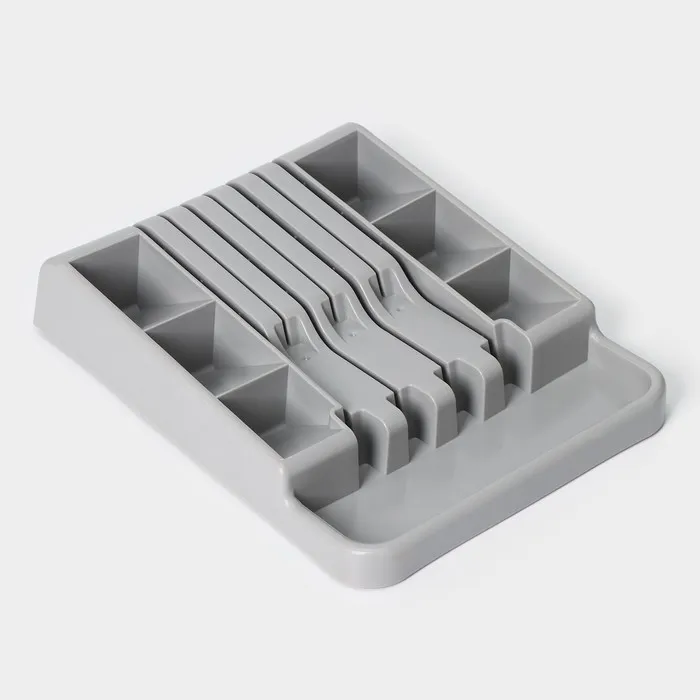 Размеры 30x23,5x5 см позволяют компактно разместить его на любой рабочей поверхности или в шкафу.Серый цвет гармонично сочетается с любым интерьером.Изготовленный из прочного пластика лоток не боится влаги и легко моется.Теперь ваши столовые приборы и ножи будут храниться в порядке и всегда под рукой.