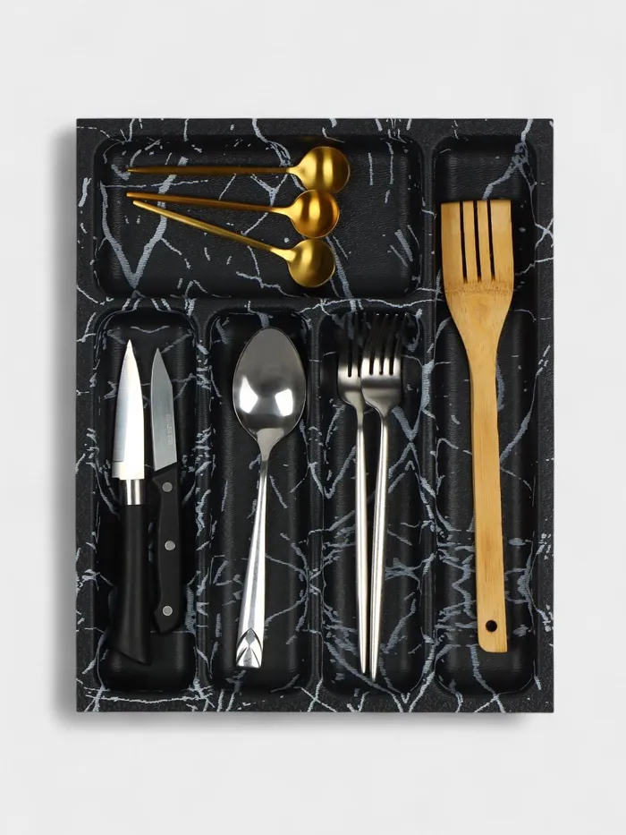 Идеальное решение для организации и хранения ваших столовых приборов. Выполненный из прочного пластика, этот лоток обеспечивает долговечность и надежность в использовании. С оптимальными размерами, он легко поместится на вашей кухне, экономя при этом пространство и поддерживая порядок в вашем кухонном гарнитуре.