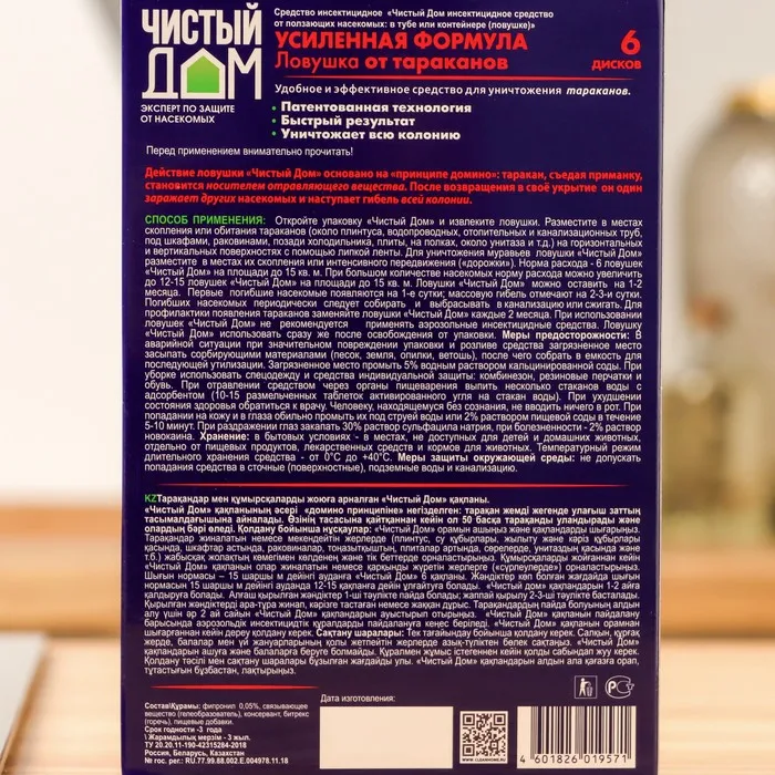 Способ применения: откройте упаковку и извлеките ловушки. Разместите в местах скопления или обитания тараканов (около плинтуса, водопроводных, отопительных и канализационных труб, под шкафами, раковинами, позади холодильника, плиты, на полках, около унитаза и т.д.) на горизонтальных и вертикальных поверхностях с помощью липкой ленты. Для уничтожения муравьев ловушки «Чистый Дом» разместите в местах их скопления или интенсивного передвижения («дорожки»).