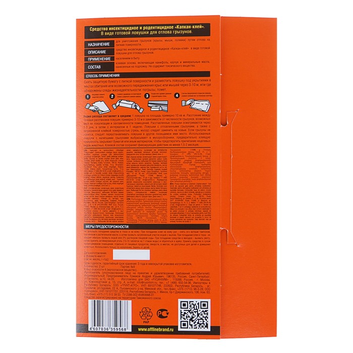 Средство инсектицидное и родентицидное "Капкан-клей" в виде готовой ловушки для отлова грызунов предназначено для уничтожения грызунов путем отлова на липкие поверхности.