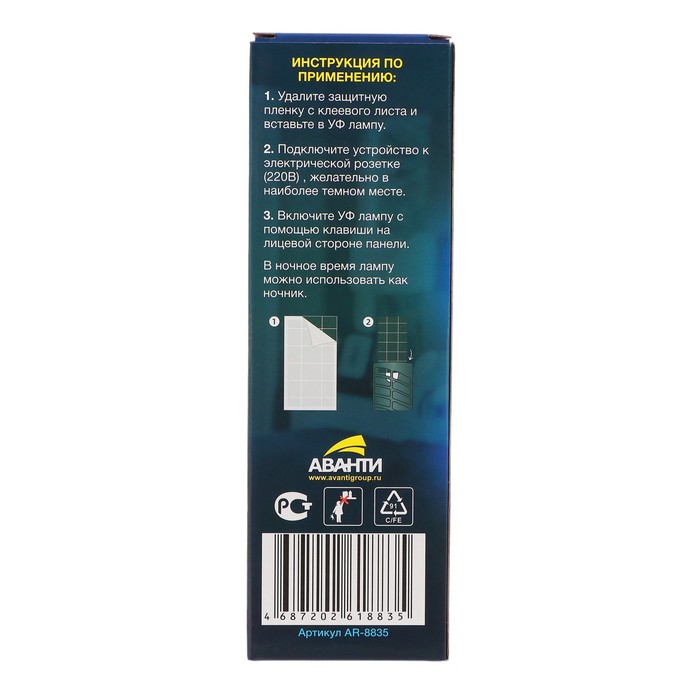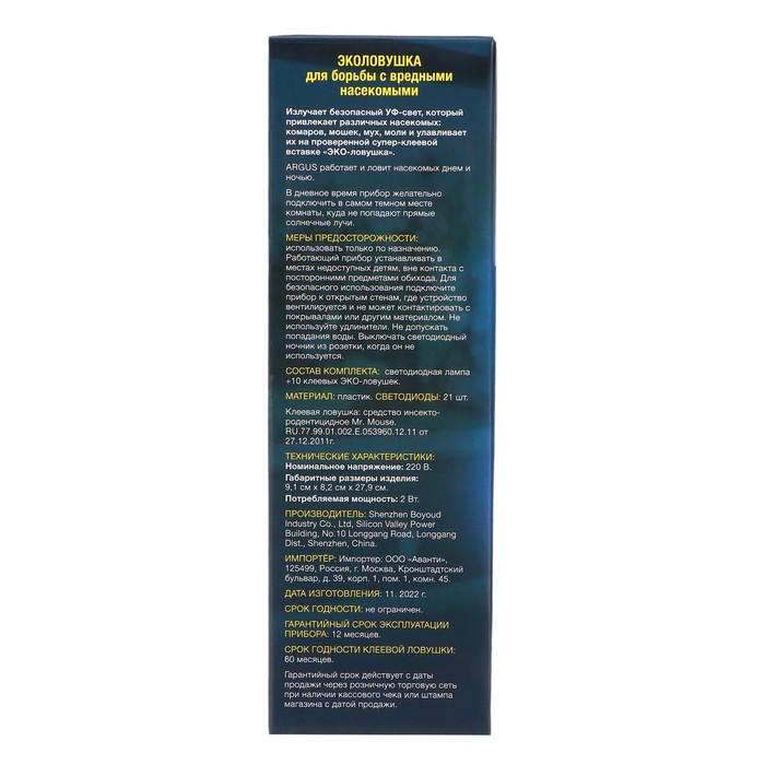 Ловушка специально разработана для использования в жилых помещениях и на террасах. Она эффективно привлекает и уничтожает мух, комаров, дрозофил и других летающих насекомых. При включении прибора в розетку 220В и наступлении темного времени суток, автоматически срабатывает датчик ультра-фиолетового света. УФ свет наиболее привлекателен для большинства насекомых, таких как комары, мошки, мухи, и т. д. Подлетев к лампе, насекомые прилипают к специальной ловушке с клеевой основой , расположенной внутри прибора. Клеевая пластина изготовлена на основе каучуковых смол , без содержания ядов и химикатов, а это очень важно при использовании прибора в детских и спальных комнатах. В отличии от инсектицидных средств борьбы с летающими насекомыми, ARGUS ЭКО ловушка может работать всю ночь и это абсолютно безопасно для Вашего здоровья. Ловушка работает и днем. Для срабатывания датчика УФ света , достаточно лишь немного приглушить дневной свет или подключить прибор в наиболее темном месте в комнате. Главное , чтобы на прибор не попадали прямые солнечные лучи. Сменная клеевая пластина , которая находиться внутри прибора и входит в комплект, рассчитана на 3 месяца защиты или меняется по мере заполнения.