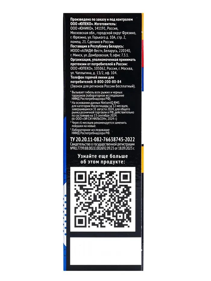 Для тараканов и муравьев гель в ловушке - это привлекательная приманкаНасекомые съедают приманку или просто задевают ее своим хитиновым покровом и становятся носителем отравляющего вещества. Через тактильный контакт они заражают своих собратьев.FIPRONIL (ФИПРОНИЛ) – контактный и кишечный инсектицид широкого спектра действия, обладает умеренными системными свойствами и хорошей остаточной активностью. Высокая кишечная активность и сильное контактное действие позволяют применять фипронил в составе инсектицидных средств в различных средствах по эффективной защите от насекомых.EMMAMECTIN BENZOATE (ЭММАМЕКТИН БЕНЗОНАТ) - инсектицид кишечно-контактного действия. Вещество воздействует на центральную нервную систему насекомого. Это приводит к расслаблению мышц (они не могут сокращаться), через 1–4 часа особи перестают питаться, а в течении 1-4 суток насекомое погибает.Инструкция: Перед использованием ловушки для тараканов проведите тщательную уборку помещения, в том числе в труднодоступных местах. Аккуратно разместите ловушки в местах обитания и передвижения тараканов. Вам понадобятся 2-3 ловушки на помещение площадью 10 м² (при невысокой численности насекомых). Важно! Не используйте аэрозоли от насекомых одновременно с ловушками, т.к. их запах отпугивает тараканов от ловушек. Для более эффективной защиты от тараканов рекомендуется заменить ловушки на новые через 2 месяца использования.