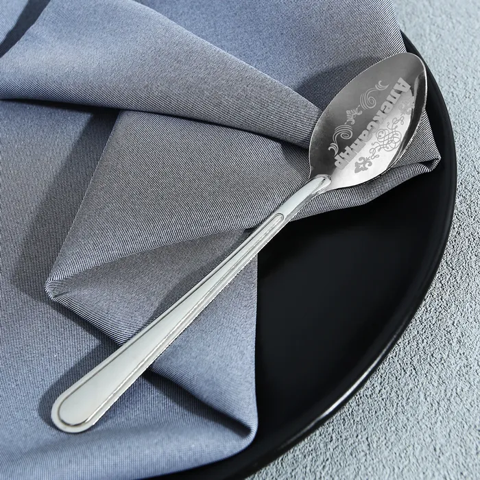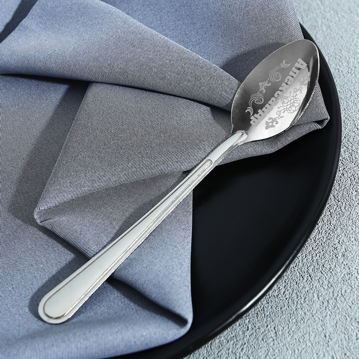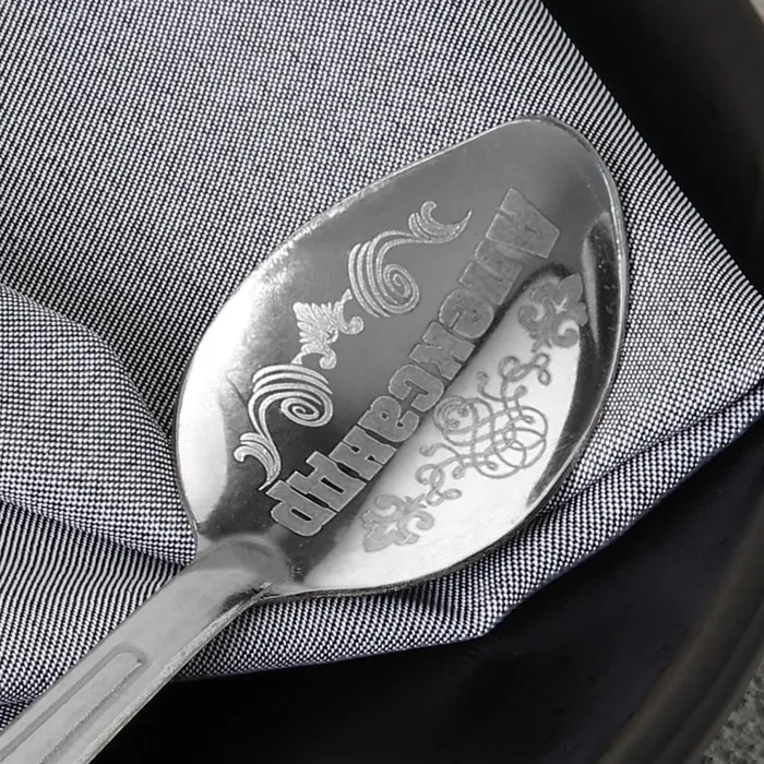 Ложка с лазерной гравировкой и изящной рукояткой преподносится на красочной открытке. На оборотной стороне изделия специально отведено место для подписи: кому и от кого был вручён подарок.