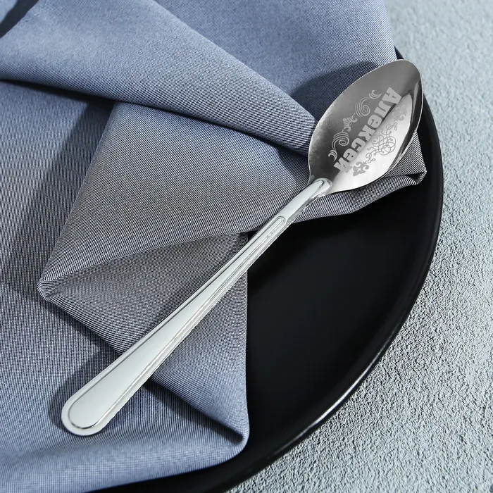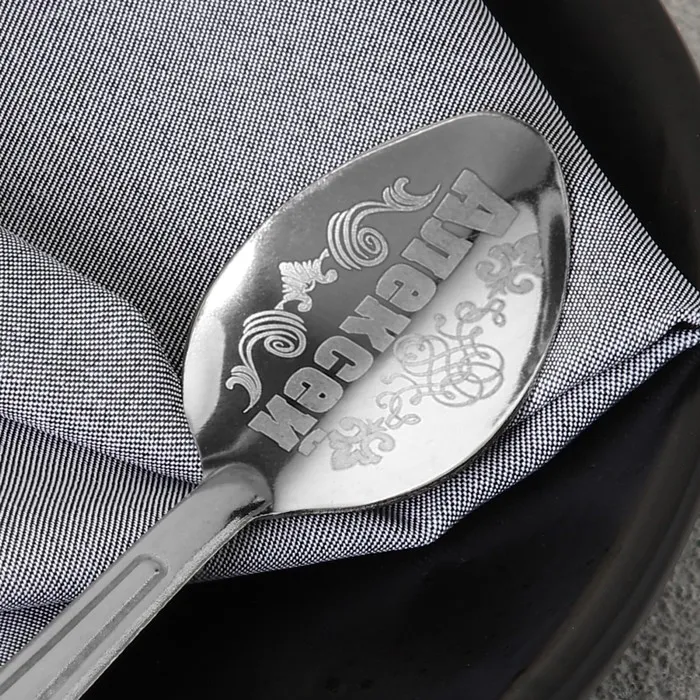 Ложка с лазерной гравировкой и изящной рукояткой преподносится на красочной открытке. На оборотной стороне изделия специально отведено место для подписи: кому и от кого был вручён подарок.