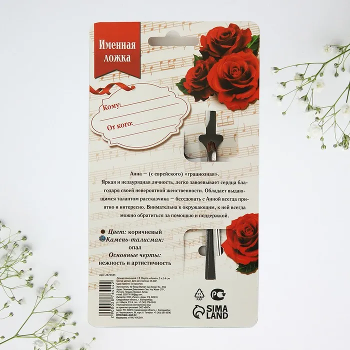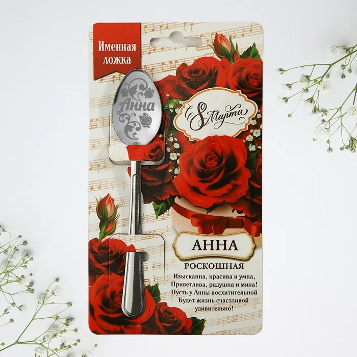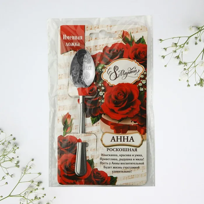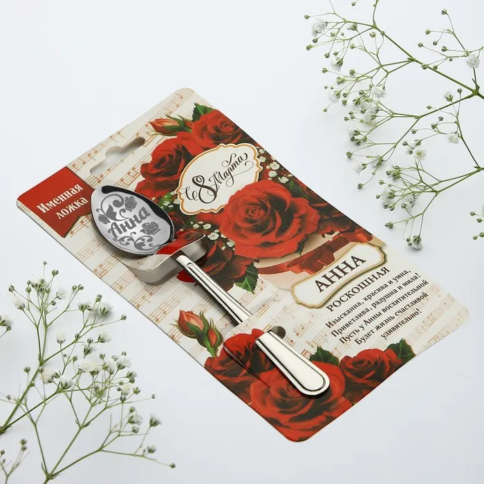 Ложка с лазерной гравировкой и изящной рукояткой преподносится на красочной открытке. На оборотной стороне изделия специально отведено место для подписи: кому и от кого был вручён подарок.