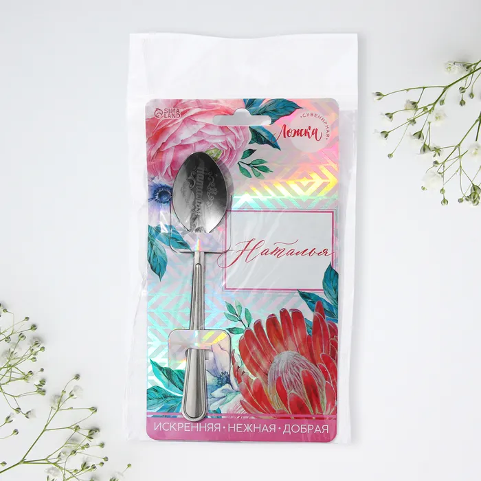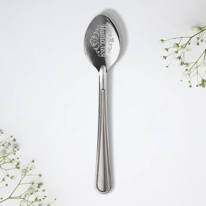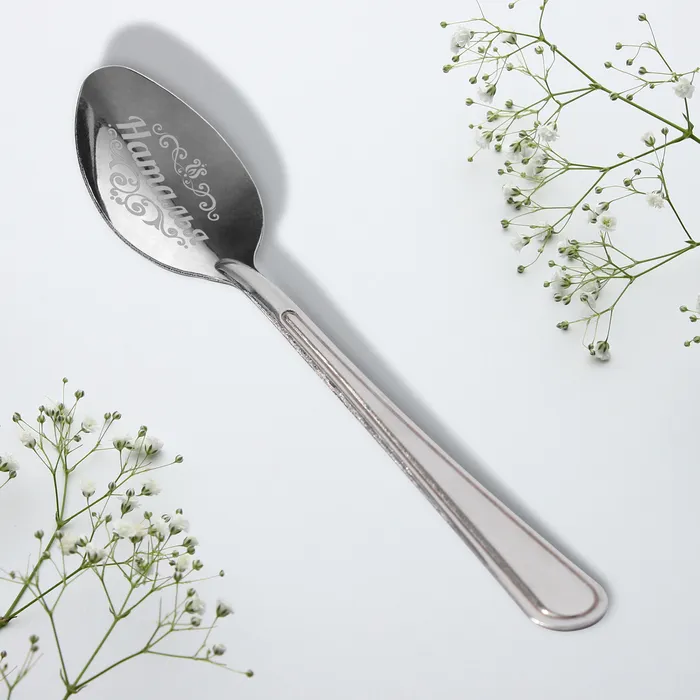 Ложка с лазерной гравировкой и изящной рукояткой преподносится на красочной открытке. На оборотной стороне изделия специально отведено место для подписи: кому и от кого был вручён подарок.