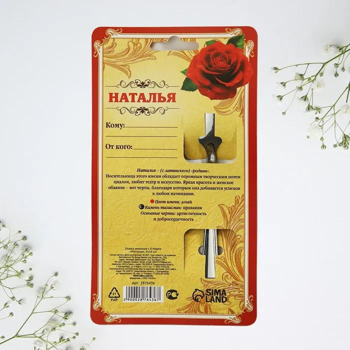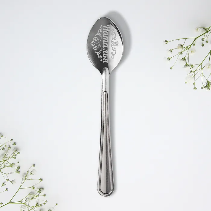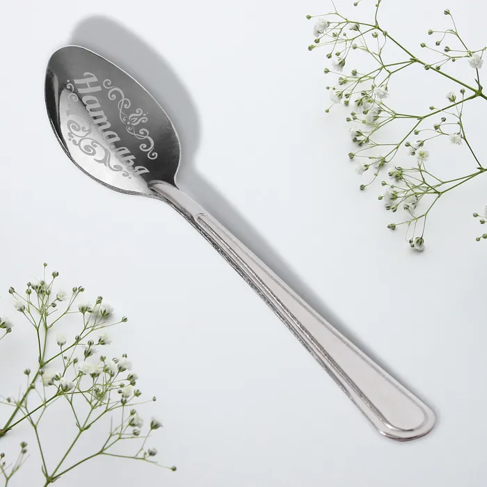 Ложка с лазерной гравировкой и изящной рукояткой преподносится на красочной открытке. На оборотной стороне изделия специально отведено место для подписи: кому и от кого был вручён подарок.