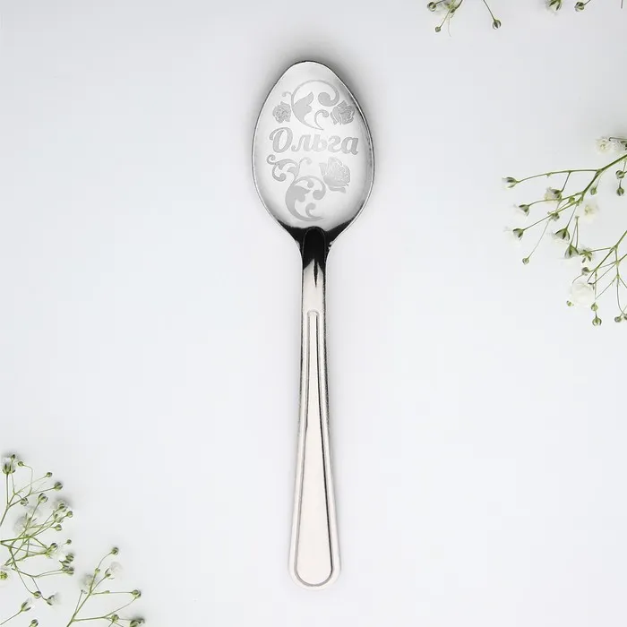 Ложка с лазерной гравировкой и изящной рукояткой преподносится на красочной открытке. На оборотной стороне изделия специально отведено место для подписи: кому и от кого был вручён подарок.