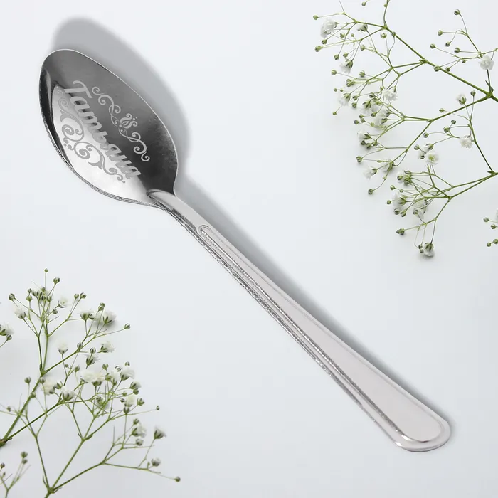 Ложка с лазерной гравировкой и изящной рукояткой преподносится на красочной открытке. На оборотной стороне изделия специально отведено место для подписи: кому и от кого был вручён подарок.