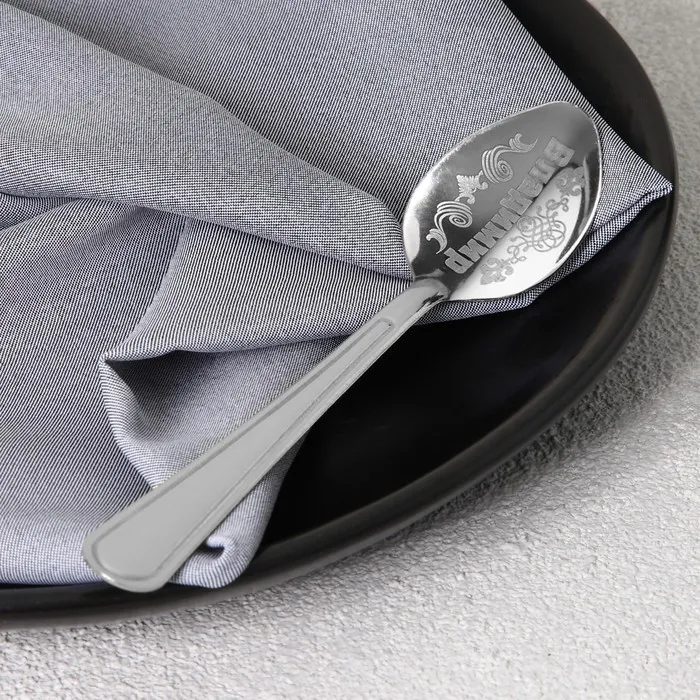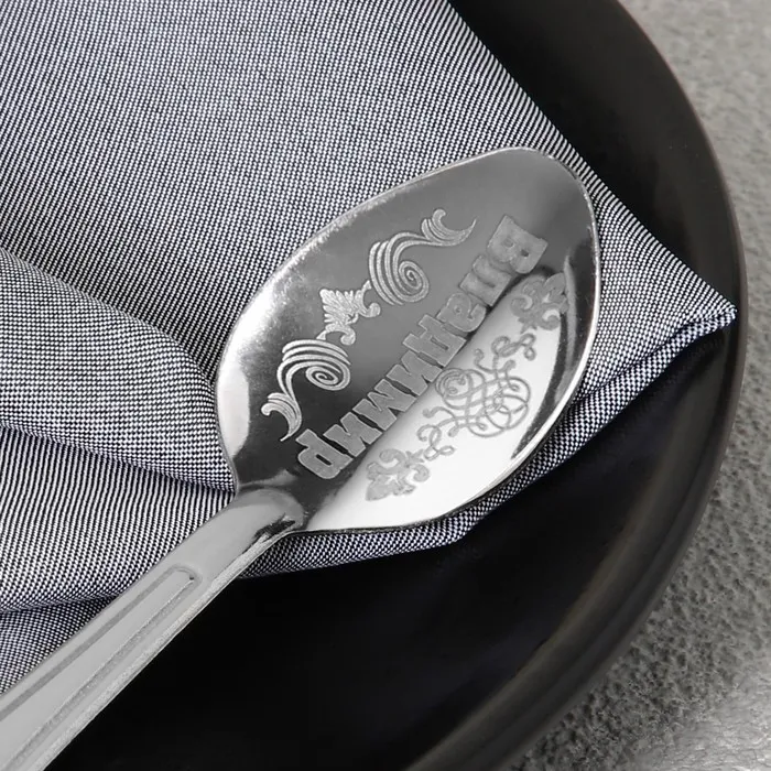 Ложка с лазерной гравировкой и изящной рукояткой преподносится на красочной открытке. На оборотной стороне изделия специально отведено место для подписи: кому и от кого был вручён подарок.