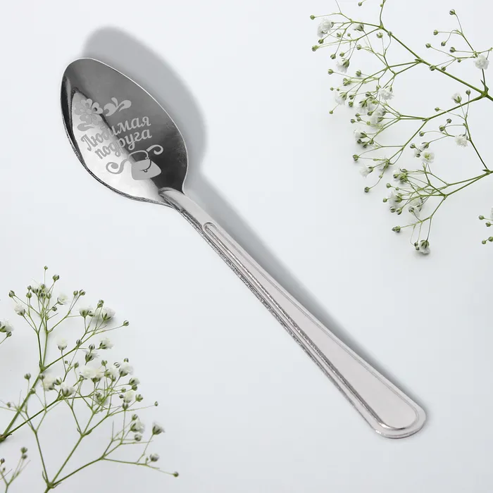 Ложка с лазерной гравировкой и изящной рукояткой преподносится на красочной открытке. На оборотной стороне изделия специально отведено место для подписи: кому и от кого был вручён подарок.